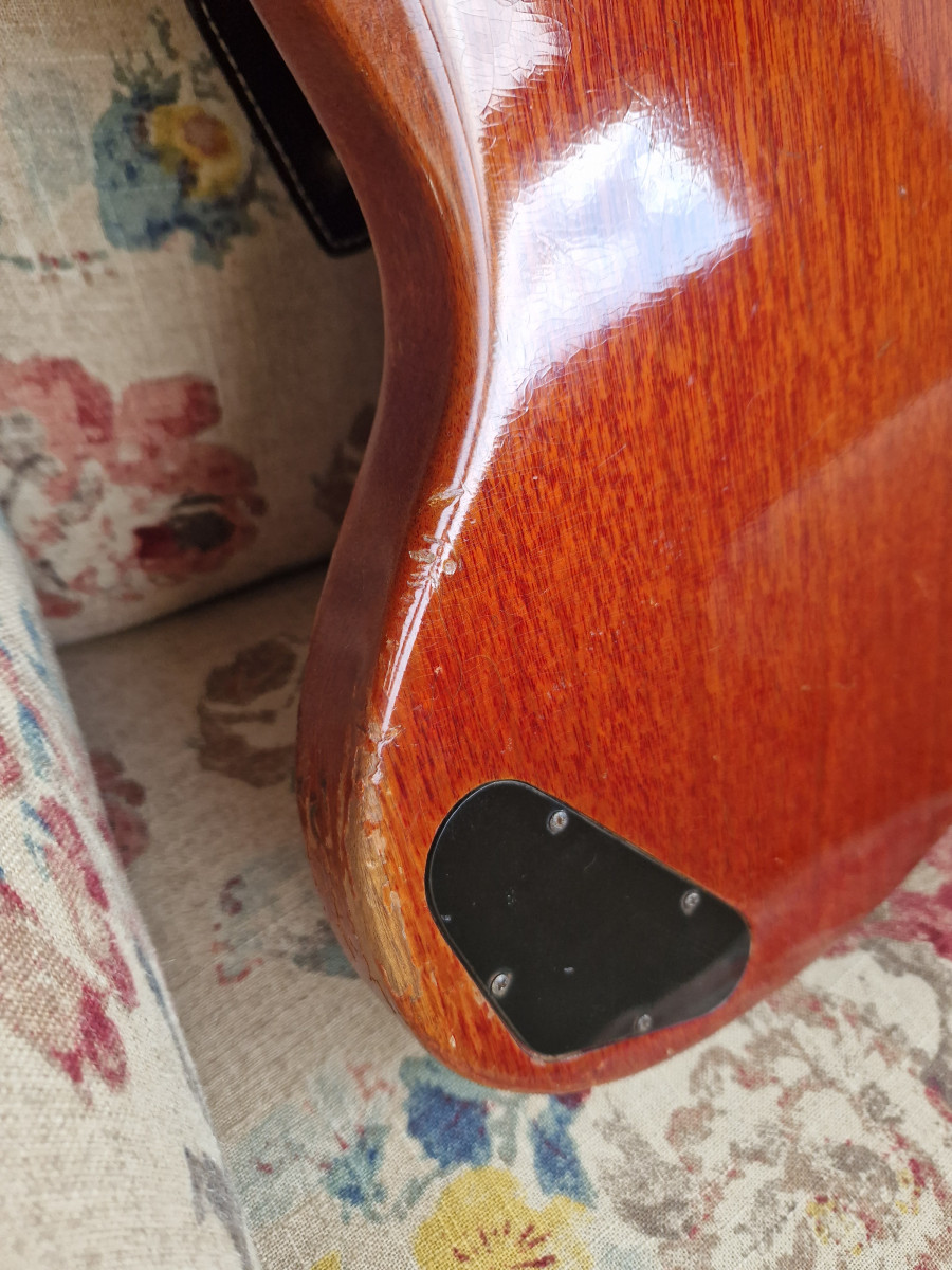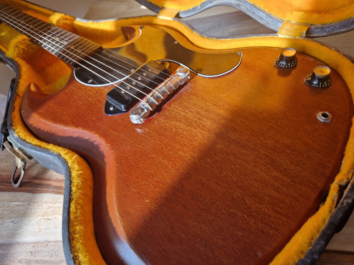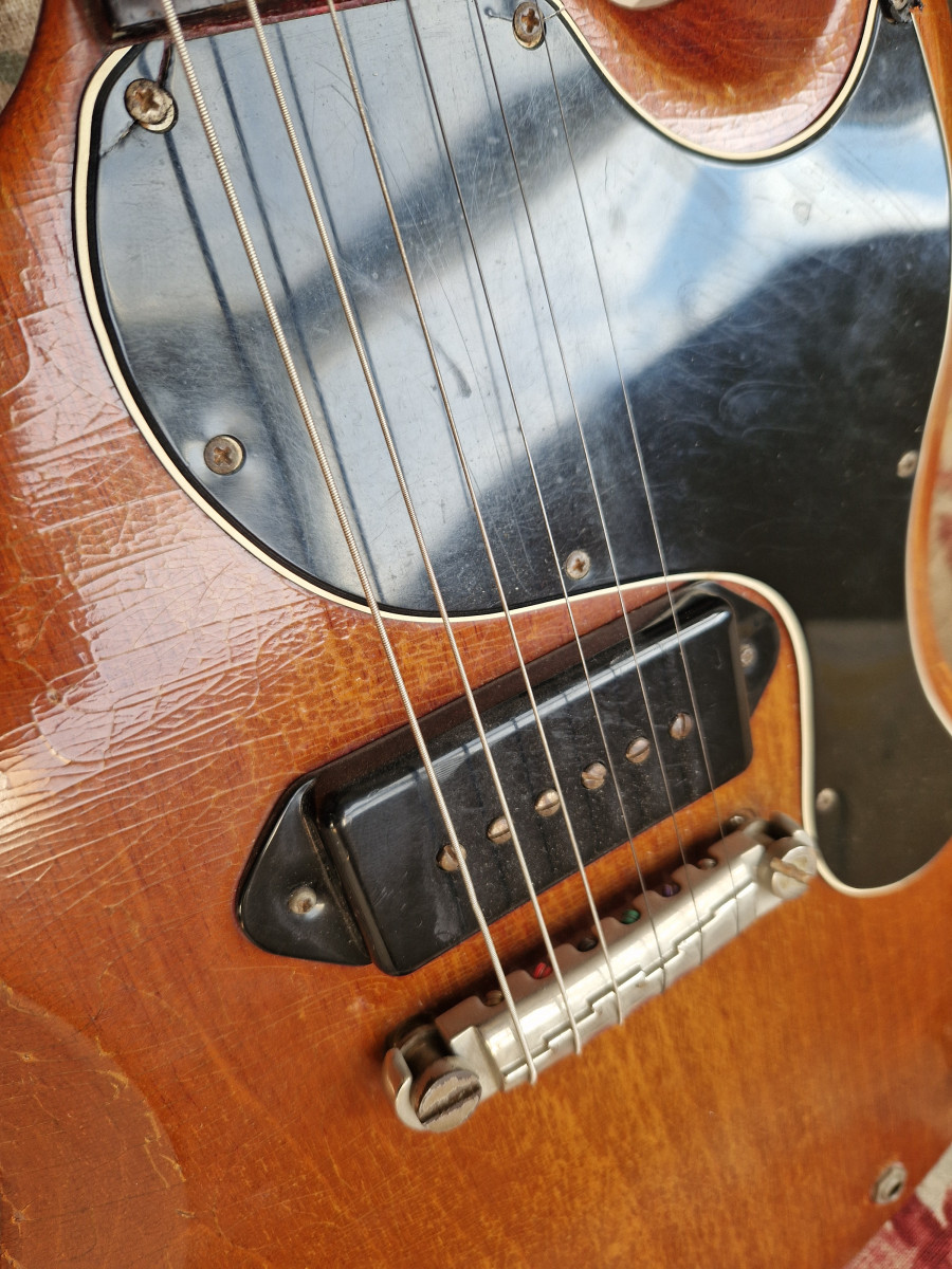 La guitarra esta en estado original menos trastes y puente que lleva uno compensado conservo original con su error histórico lleva estuche original lifton. Pastilla potes soldaduras etc intactas sonando cómo un cañón...la pastilla es mágica.