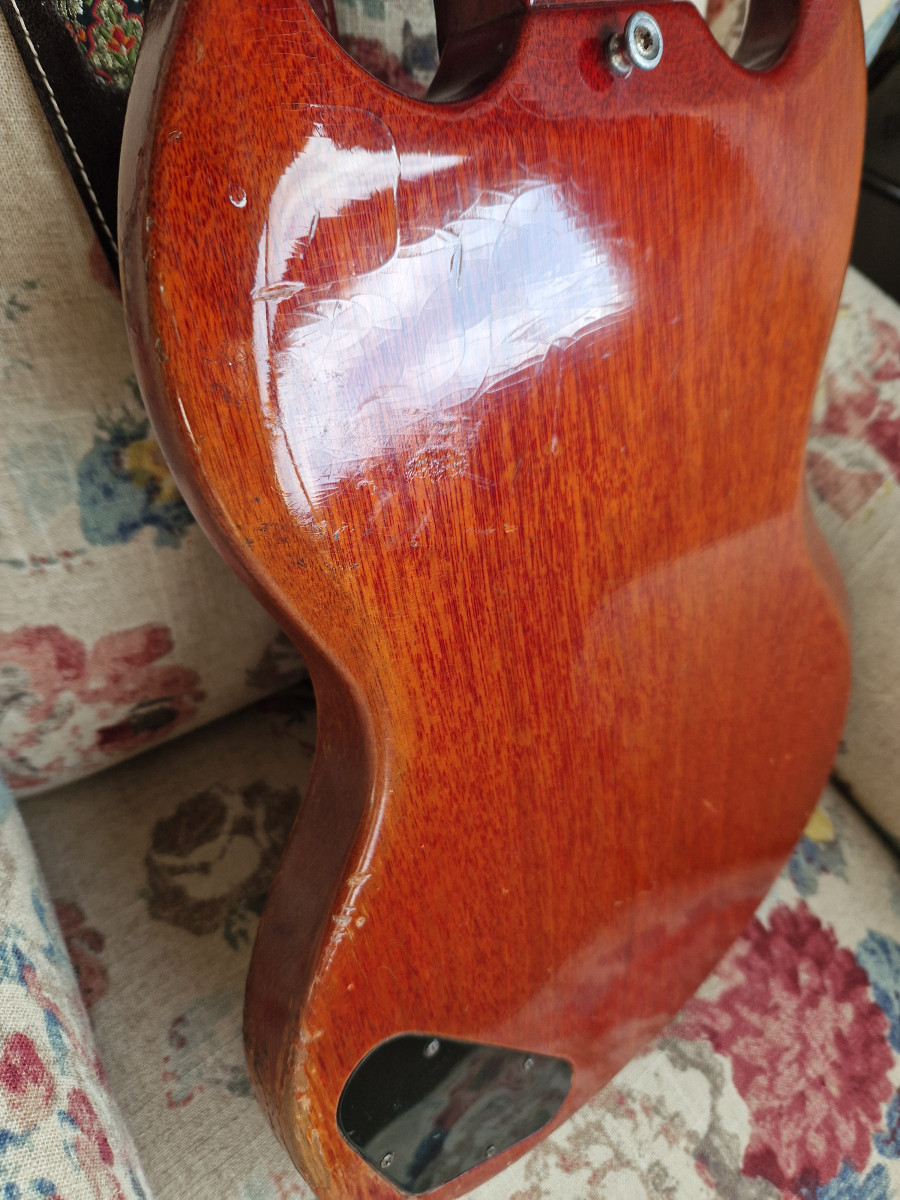 La guitarra esta en estado original menos trastes y puente que lleva uno compensado conservo original con su error histórico lleva estuche original lifton. Pastilla potes soldaduras etc intactas sonando cómo un cañón...la pastilla es mágica.
