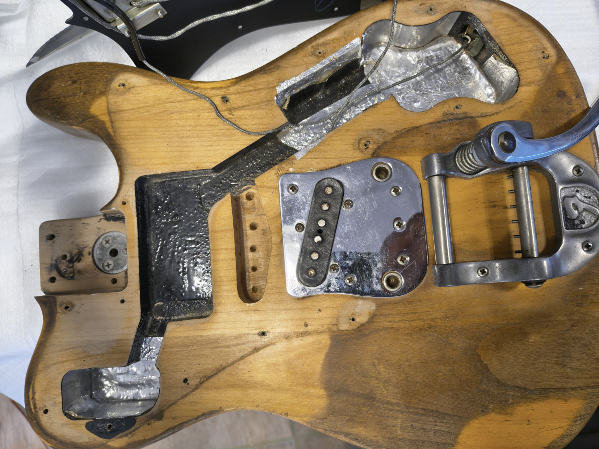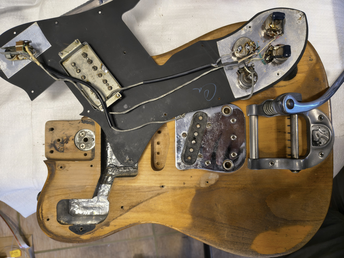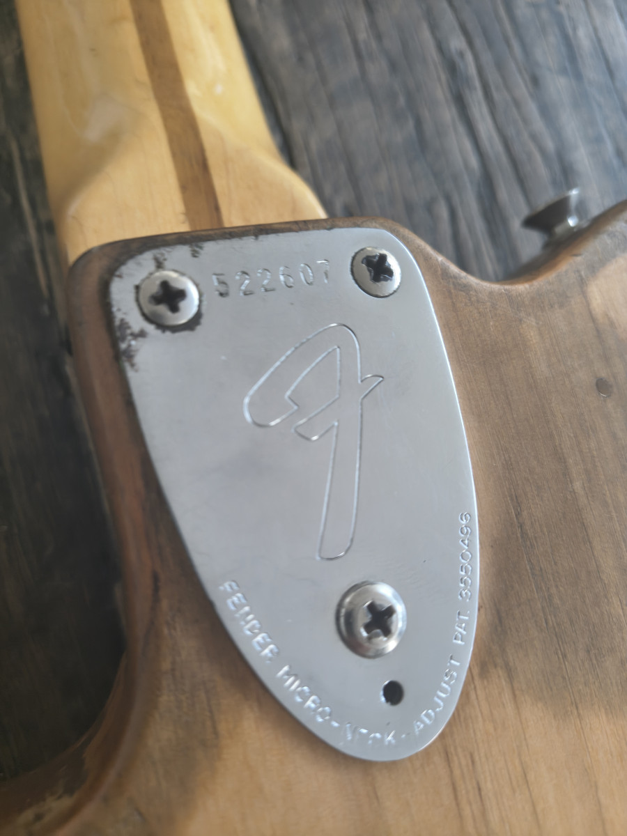 A principios de los 80, se modificó: se le añadió una pastilla central y un selector de 3 posiciones, lo que hizo que el cuerpo quedara rooteado.Se han quitado todas esas modificaciones y por suerte el golpeador original no se cortó y está incluido.
