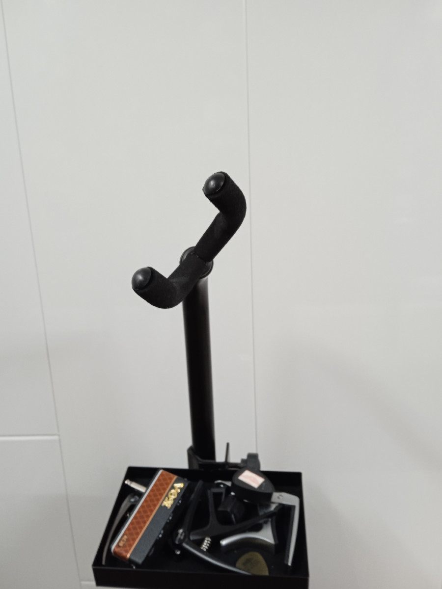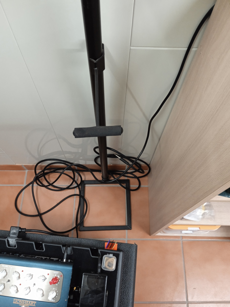 Soporte metálico negro de altura ajustable,bandeja y "tope" ajustable,ideal para locales de ensayo.es muy estable,pero en casa me estorba mas que otra cosa.