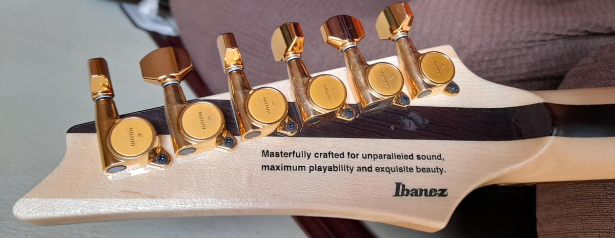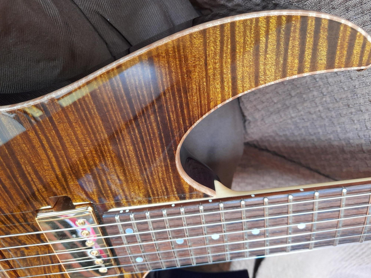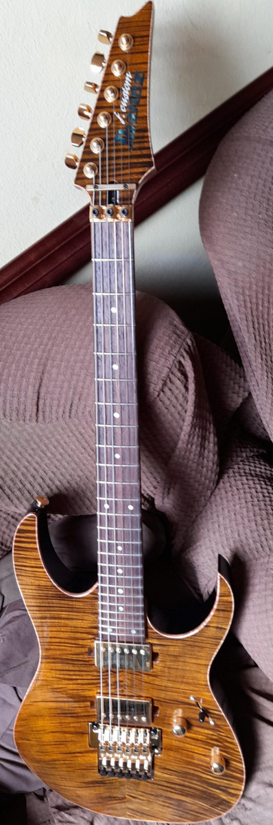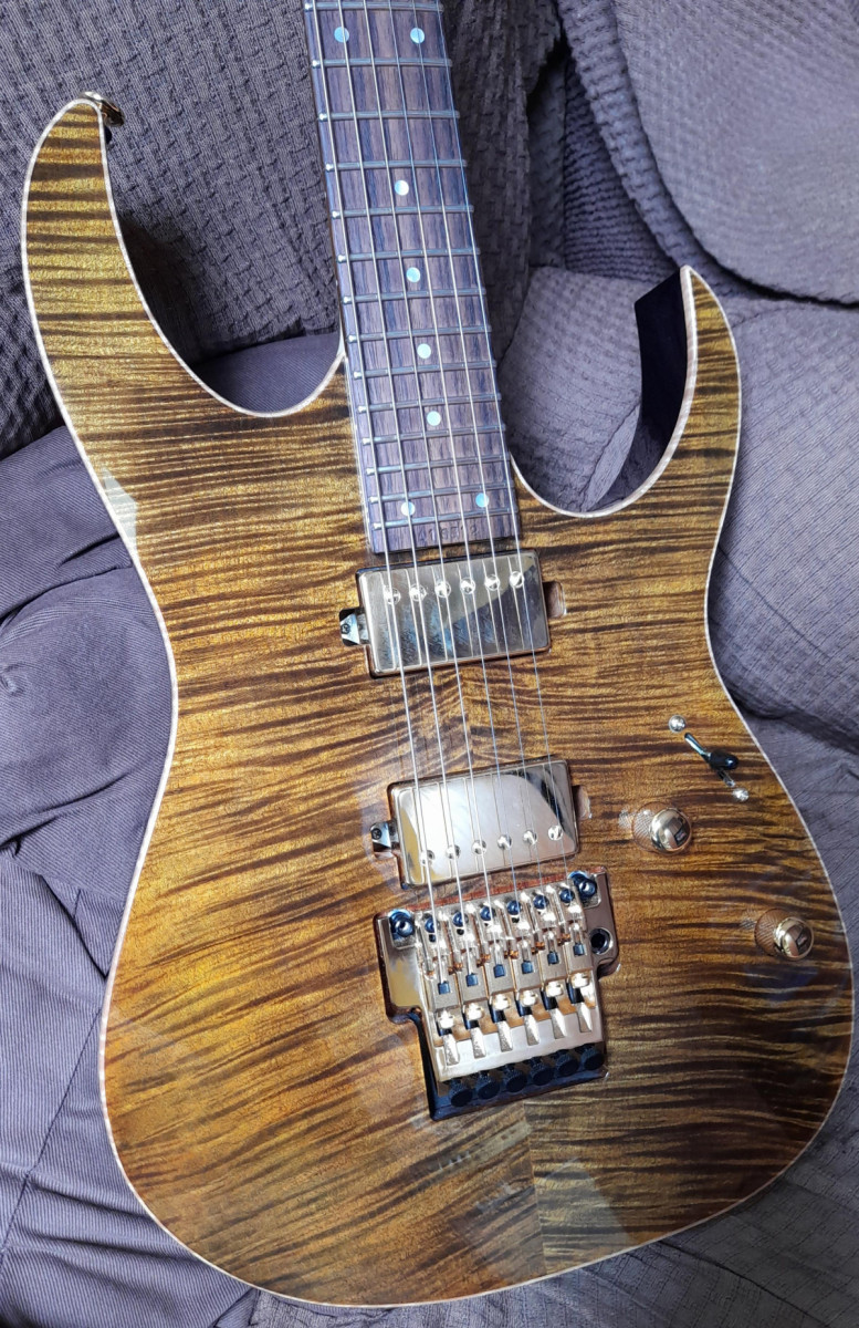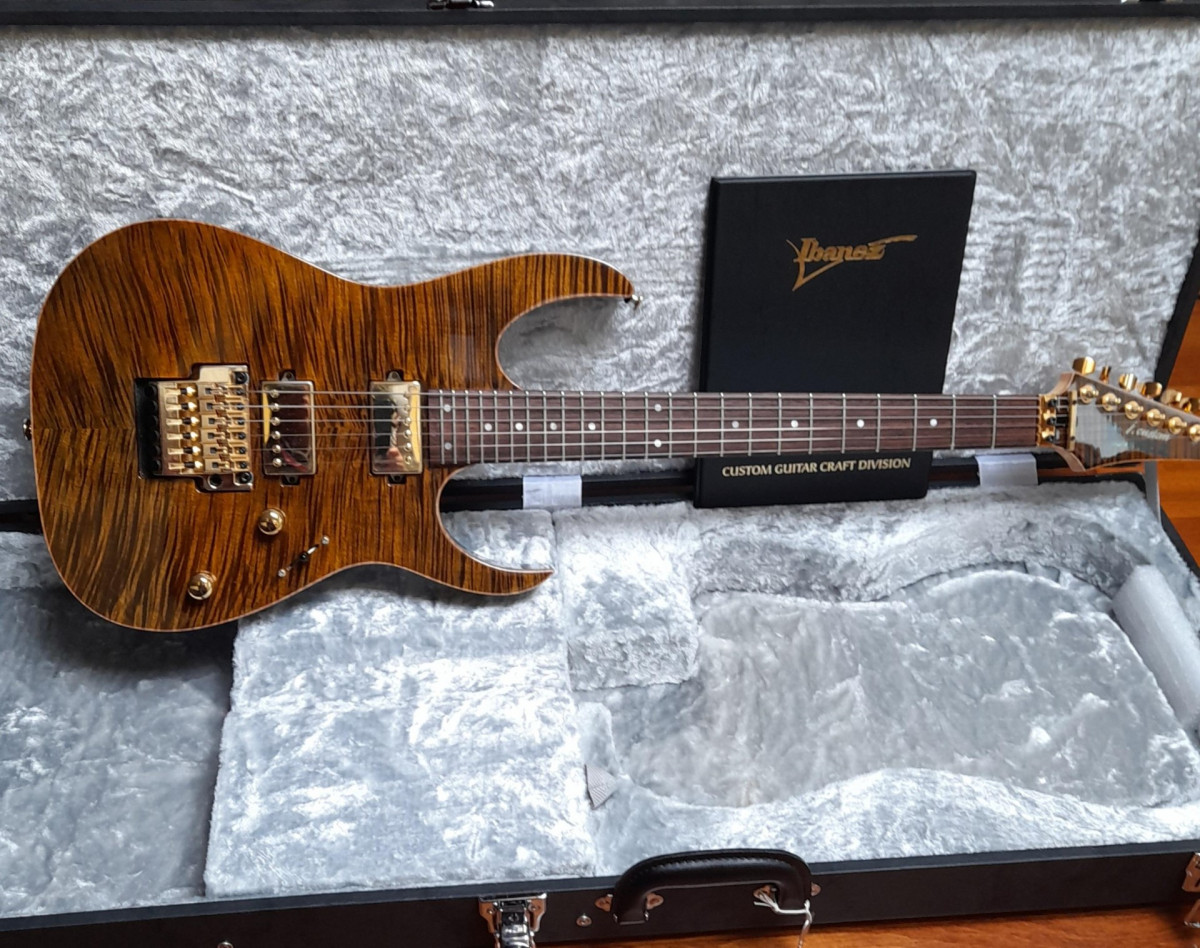 Ibanez J Custom RG11R de edición limitada, en color Golden Tiger Eye, parte trasera color púrpura, precioso, sobre todo a la luz.