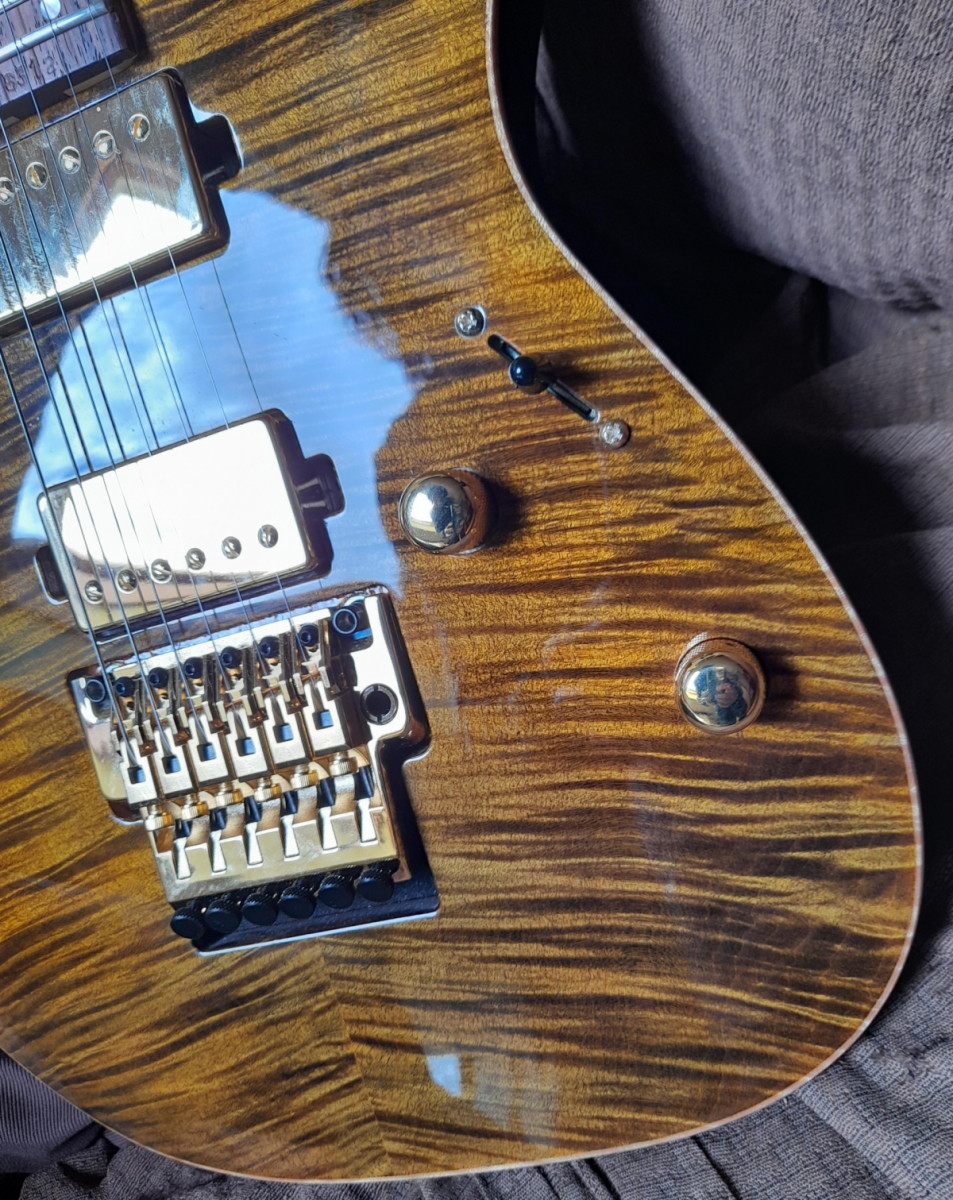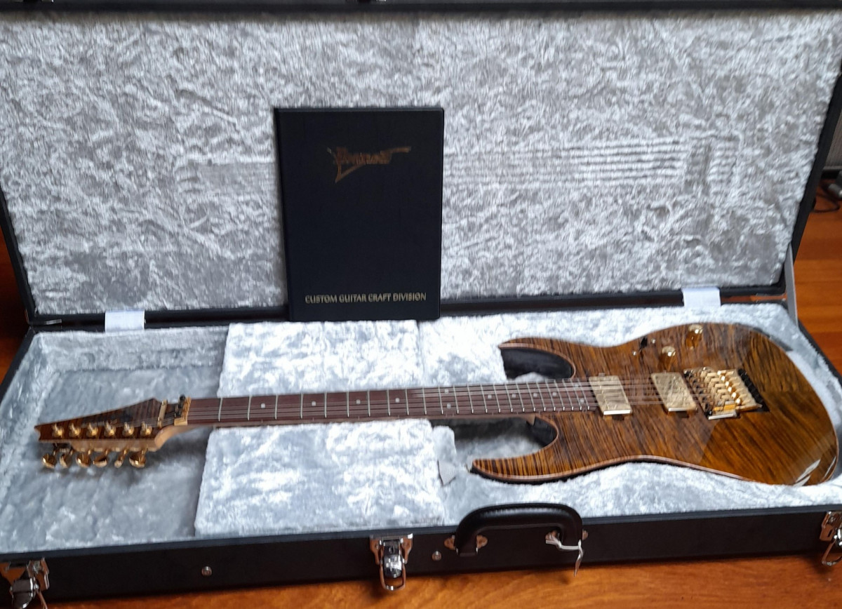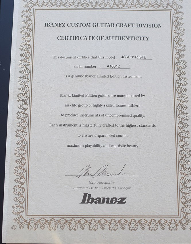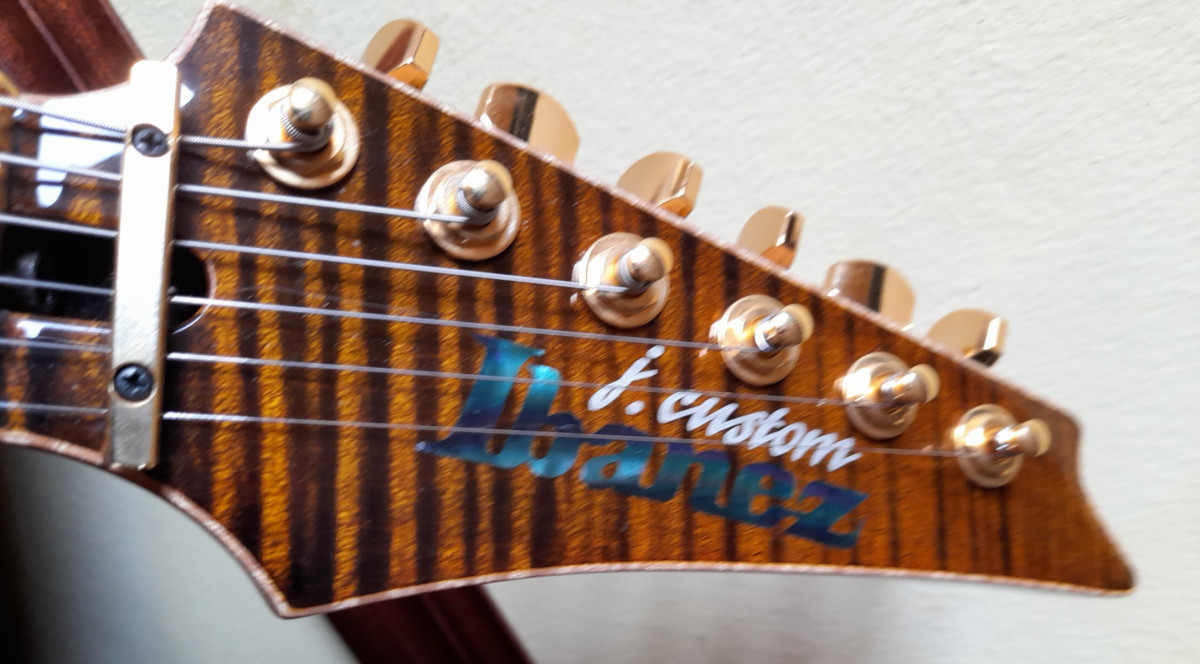 Éstos modelos sólo se hicieron en el año 2011. Cuerpo de caoba africana, preciosa tapa flameada de arce exótico en cuerpo y pala, escala 24,75 " (algo novedoso y muy deseado en una Ibanez), puente Lo-Pro Edge de bajo perfil, pastillas Dimarzio Paf 36º Anniversary con gold covers, entrego también las originales J Custom, diapasón de palorosa seleccionado, marcadores en madreperla, logo en abalone y paúa, Gotoh B3 strap buttons para mayor seguridad, gold hardware, certificado de autenticidad, estuche Ibanez J Custom.