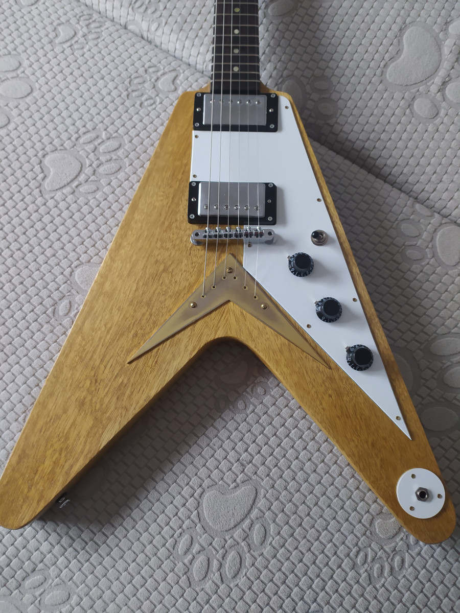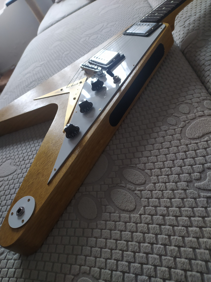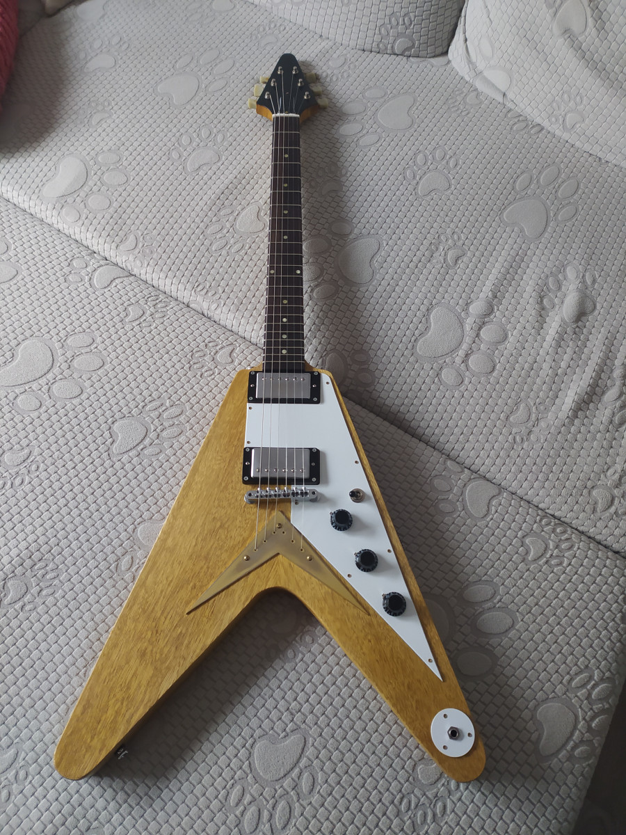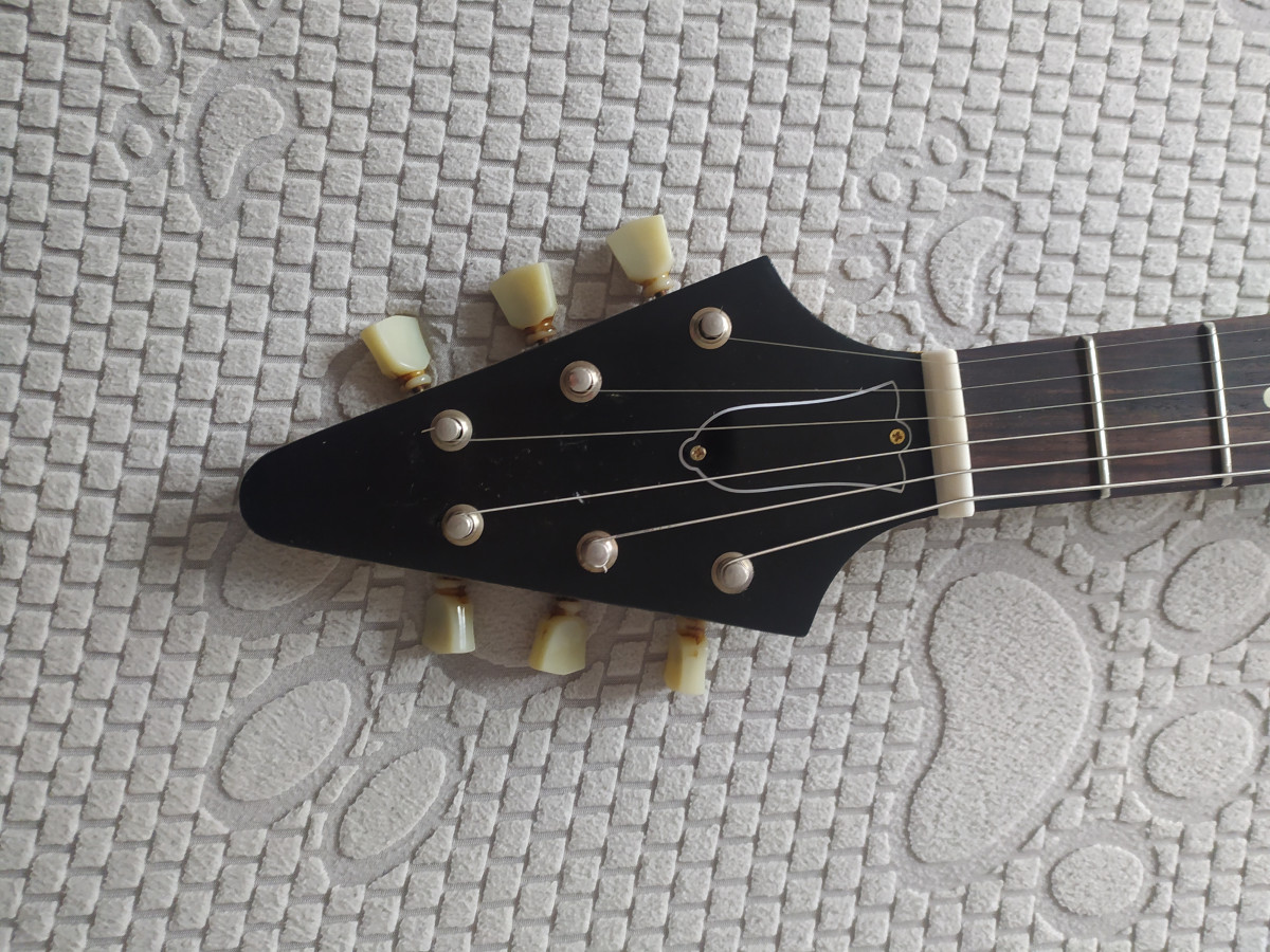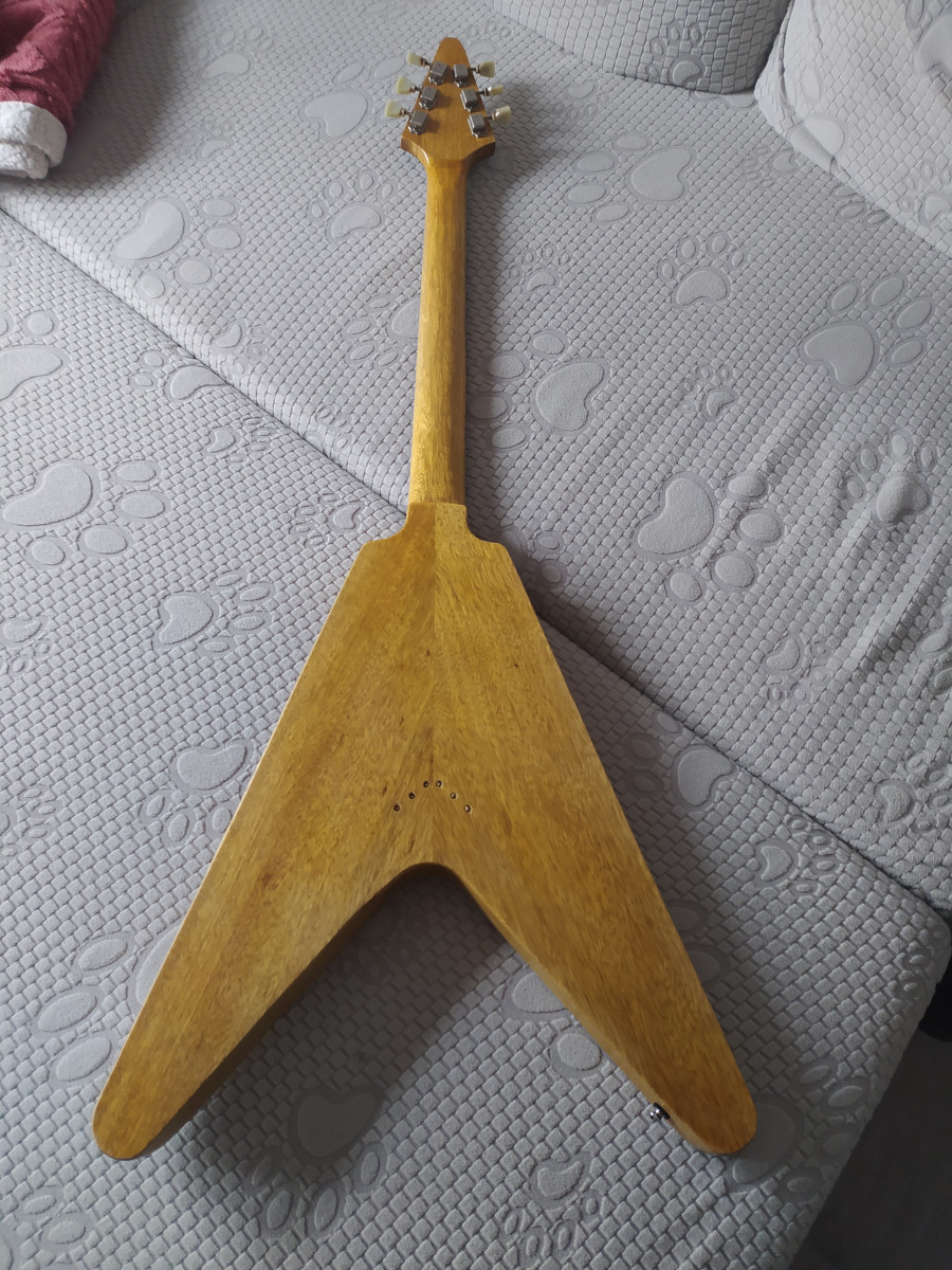 Cambio réplica de Flying V 58 Korina. Hecha a mano por mi,no es un Kit. Cuerpo y mastil de korina,diapasón de palorosa de india,trastes medium,radio 12, mástil gordito pero comodísima de tocar, pastillas alnico 5, clavijero tokai vintage.Acabado 100% nitrocelulosa.Funda blanda