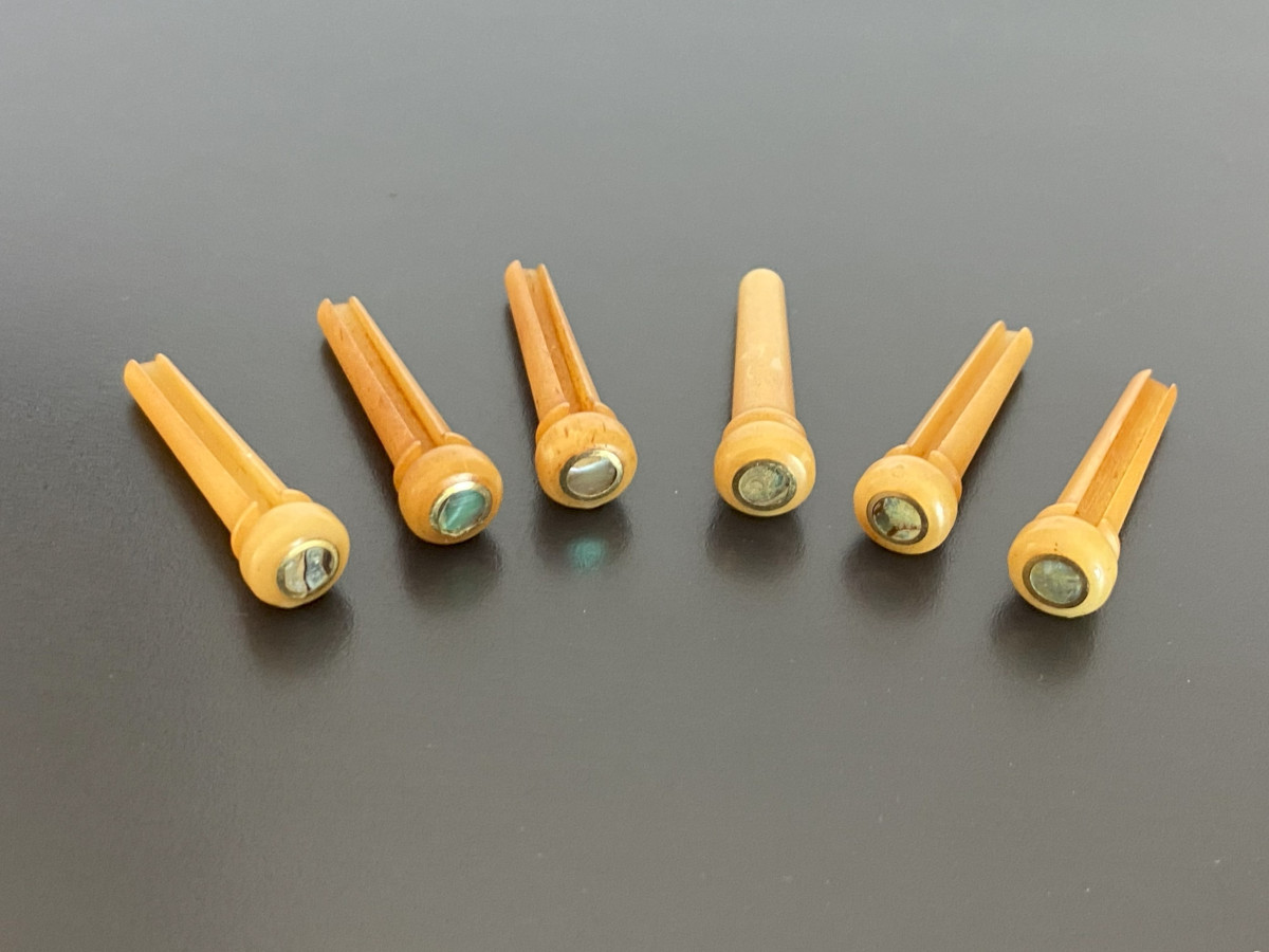 Juego de 6 clavijas de hueso camello con puntos de abulón para guitarra folk.