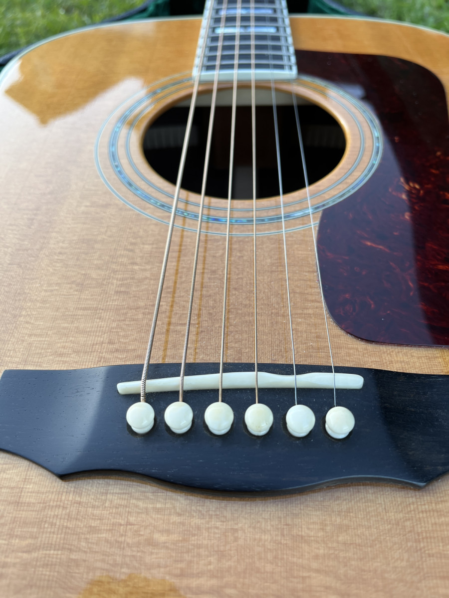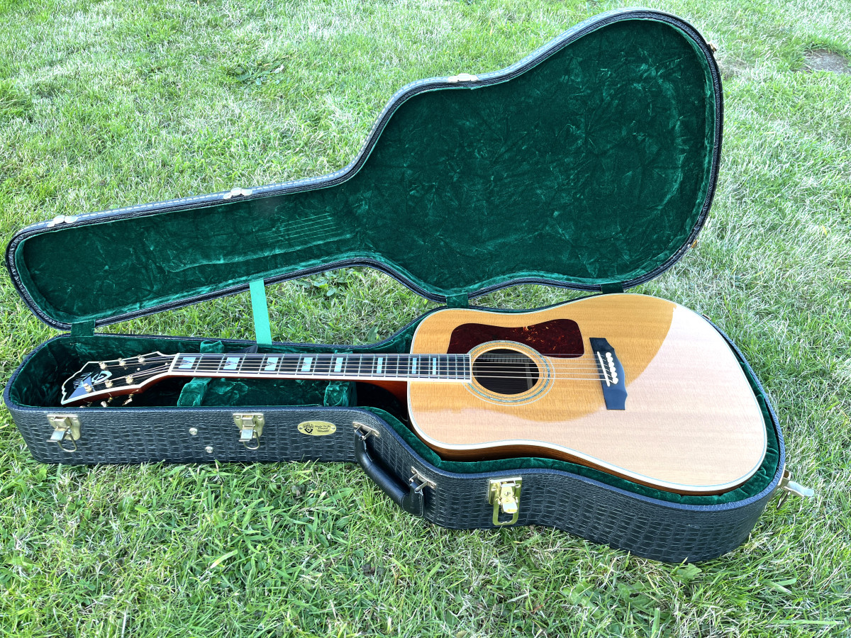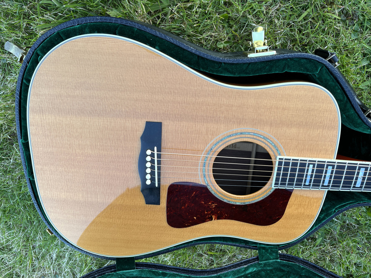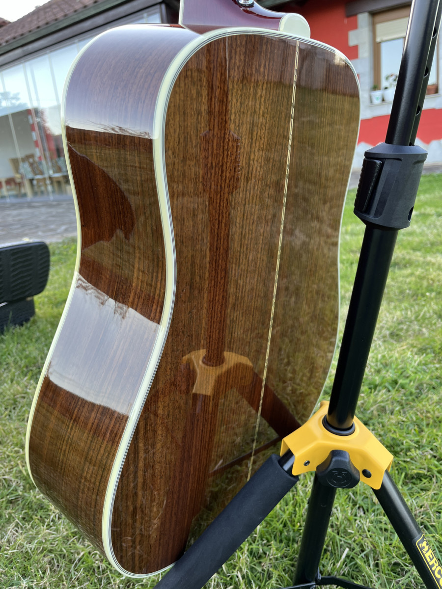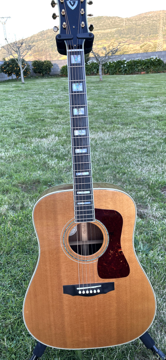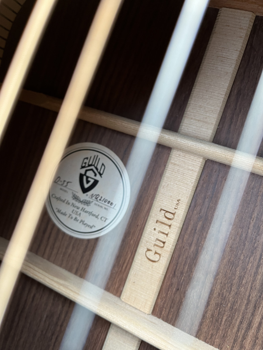 La guitarra es una Guild D55 perteneciente a la era New Hatford, es de 2013 para muchos la mejor gracias al fichaje del gran maestro luthier Ren Ferguson, que para quien no lo conozca ha sido pieza fundamental en la historia de Gibson.