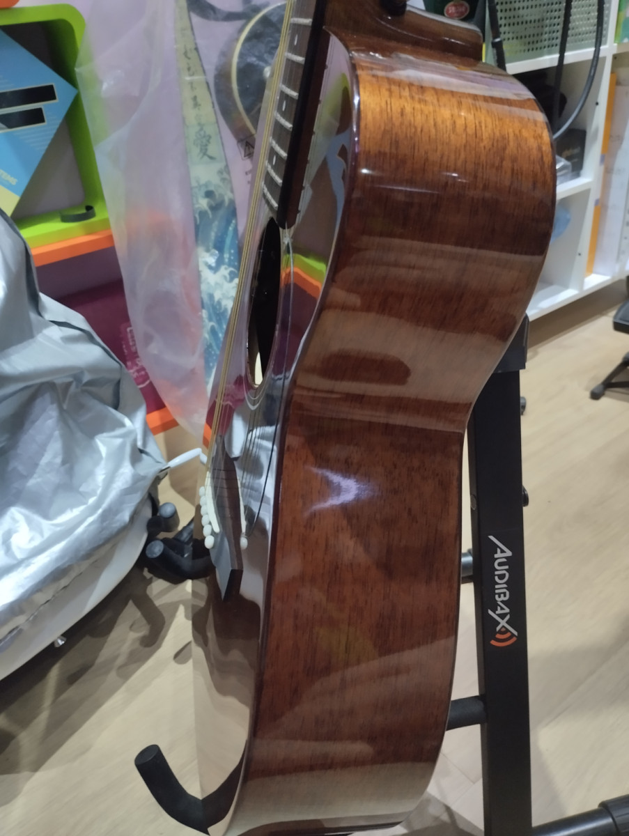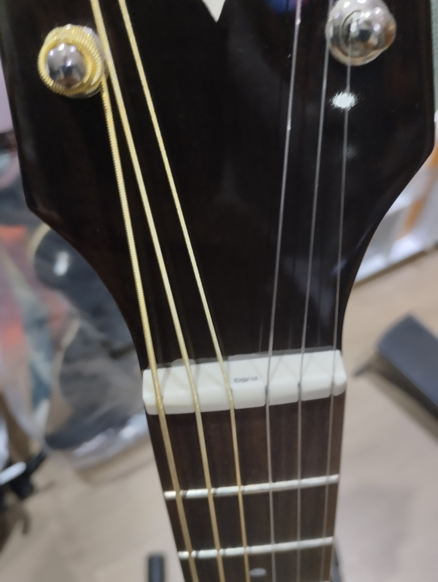 Toda maciza, con puente y cejuela TUSQ. Acabo de ponerle unas cuerdas D'Addario 13-56. Me llegó de un cambio y suena muy bien pero, aunque lo he intentado, no me seducen las acústicas.