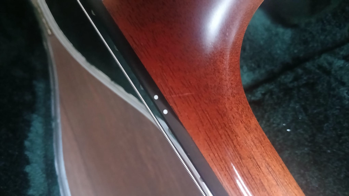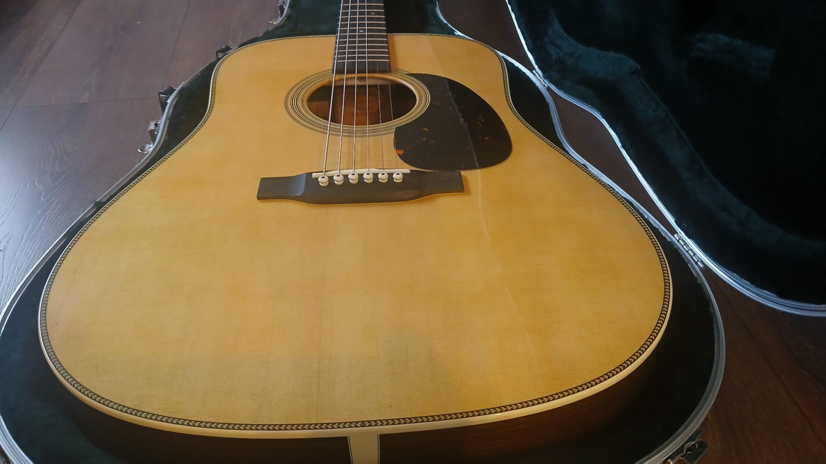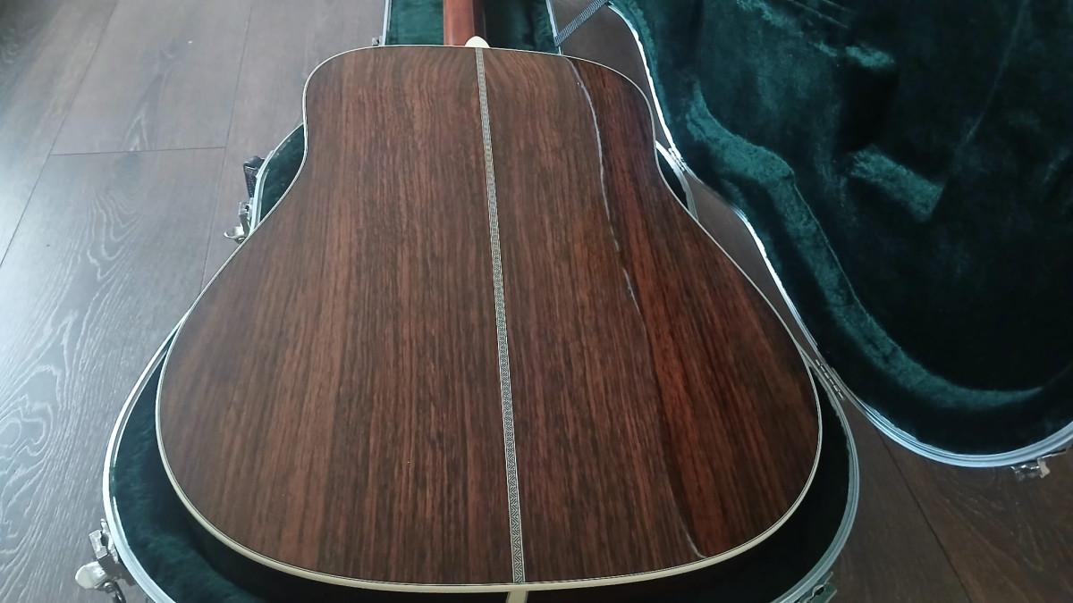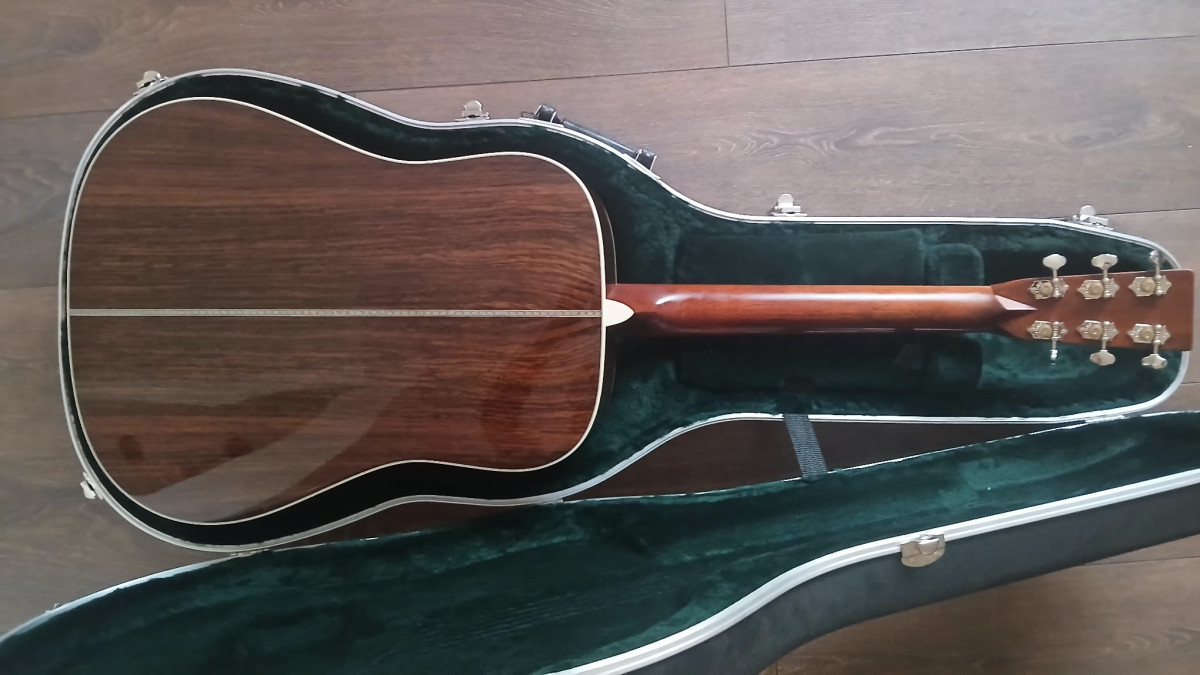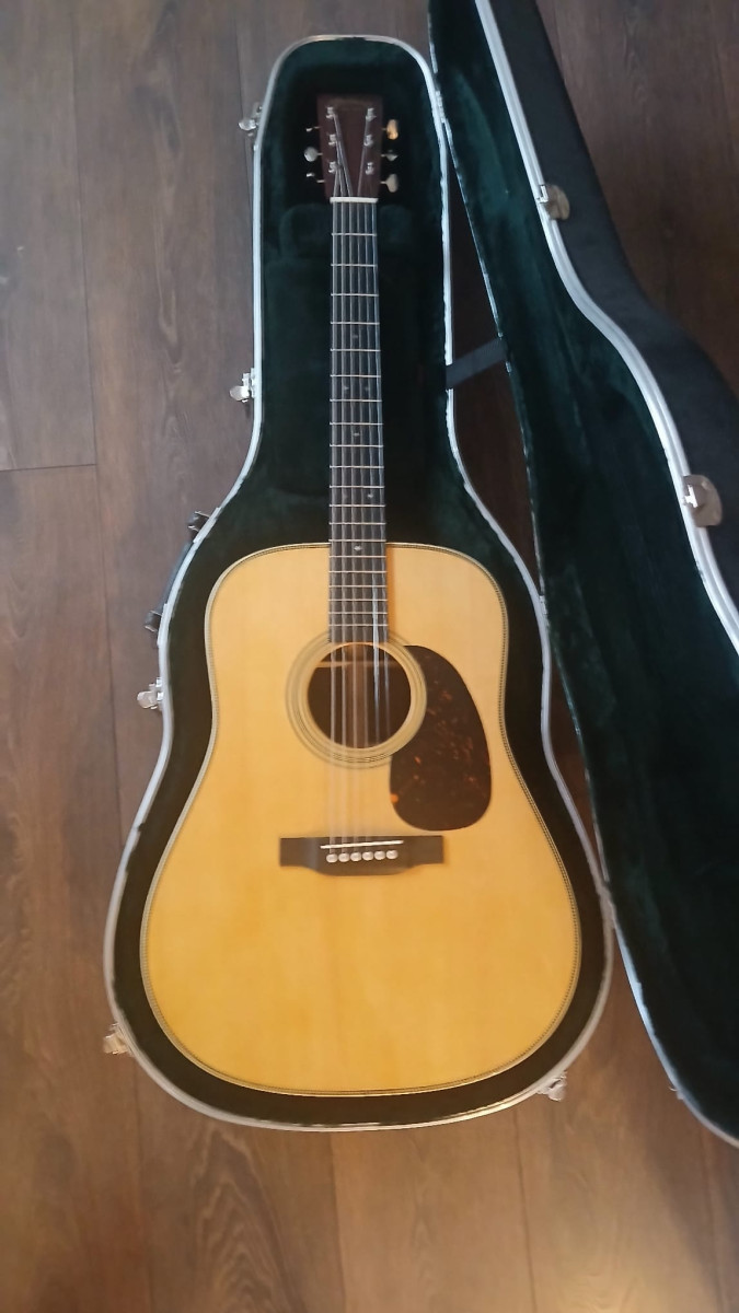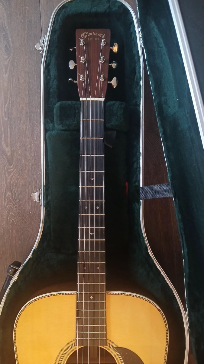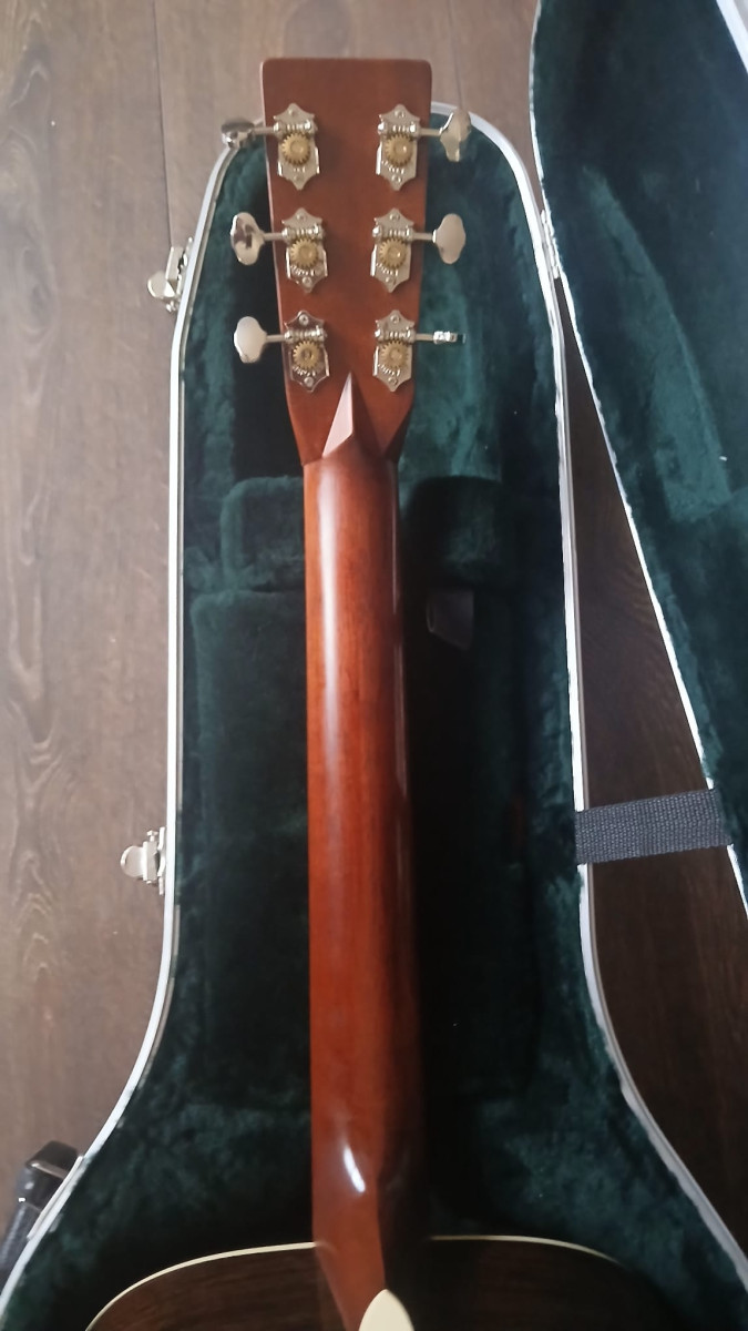 HD28 Reimagined. Se come por los pies a las anteriores a 2018, al menos a las dos con las que la he podido comparar. No he tenido la oportunidad de probar la revisión de 2025, así que de esas no puedo hablar. Está prácticamente nueva, salvo un ding minúsculo en la pintura del mástil. Por lo demás, está como salida de la tienda. Si el estándar indiscutible de la guitarra dreadnought es la Martin D28, la HD es un paso más en sonido. Un braceado escalopado permite a la tapa vibrar más, lo que se traduce en más graves y más volumen. La verdad es que el sonido, la comodidad y la afinación son insuperables.