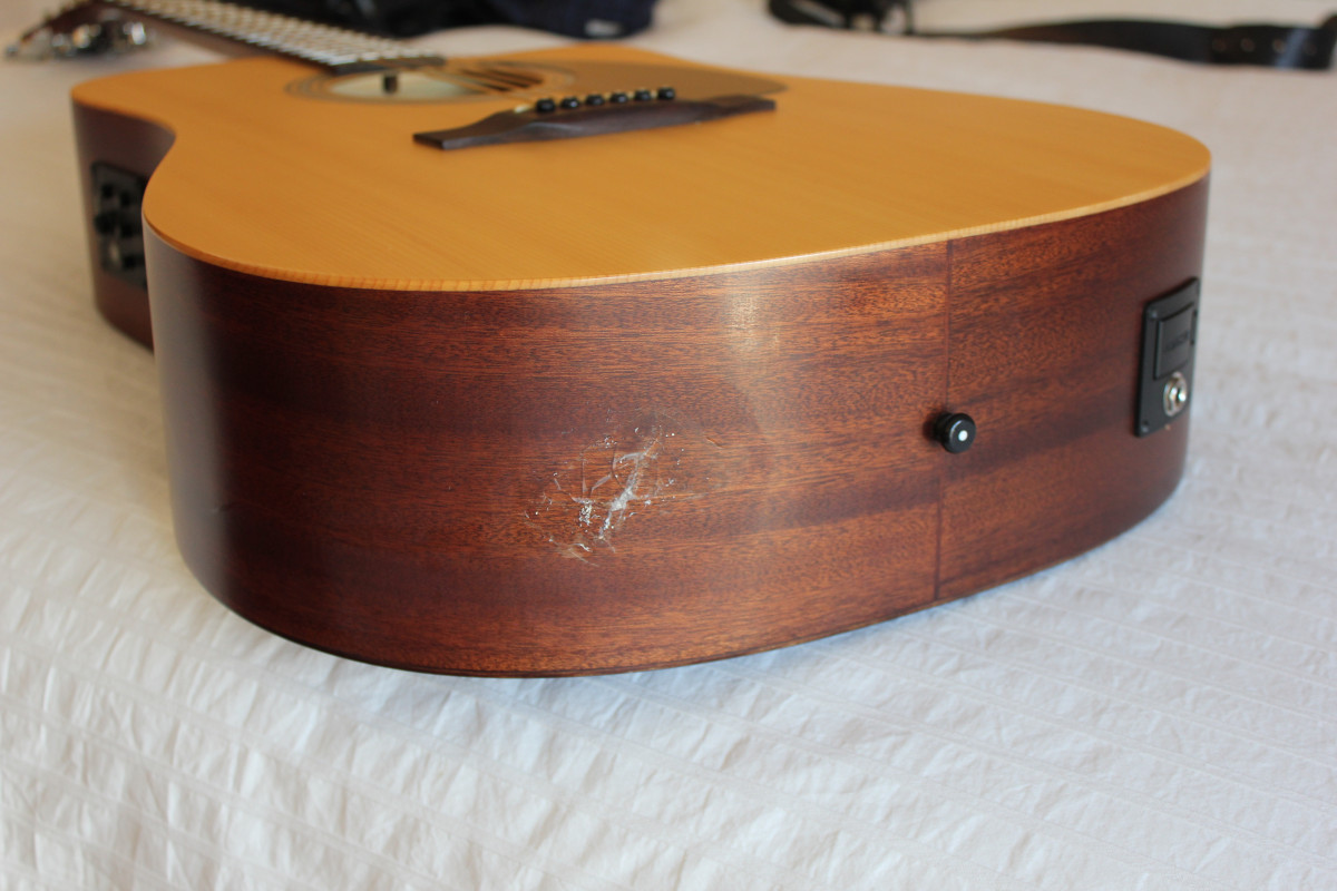 - La marca en la parte de abajo de la guitarra, superficial y reparada por luthier. No afecta para nada al sonido ni a la estructura de la guitarra.