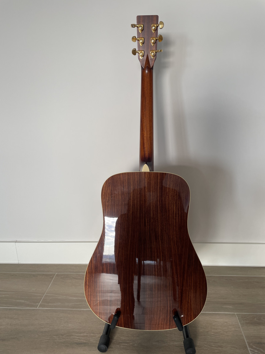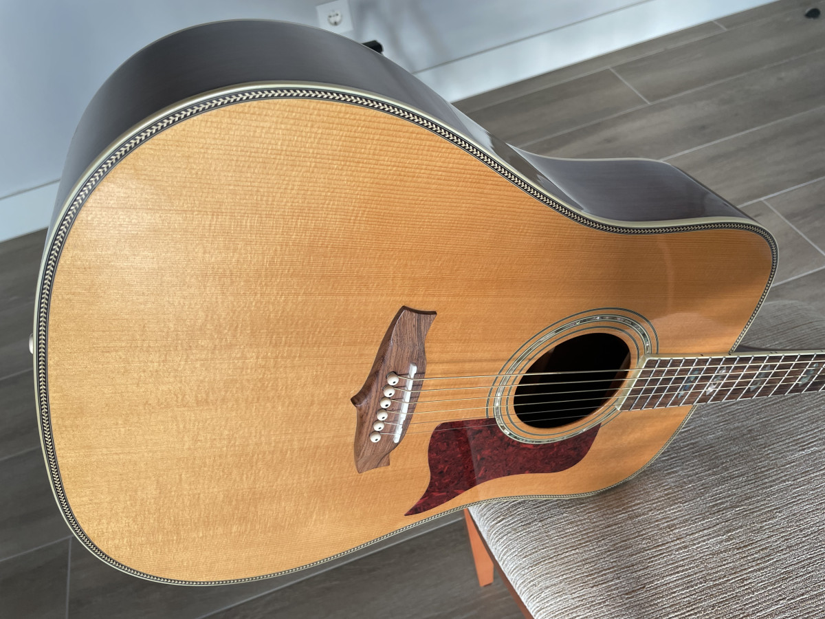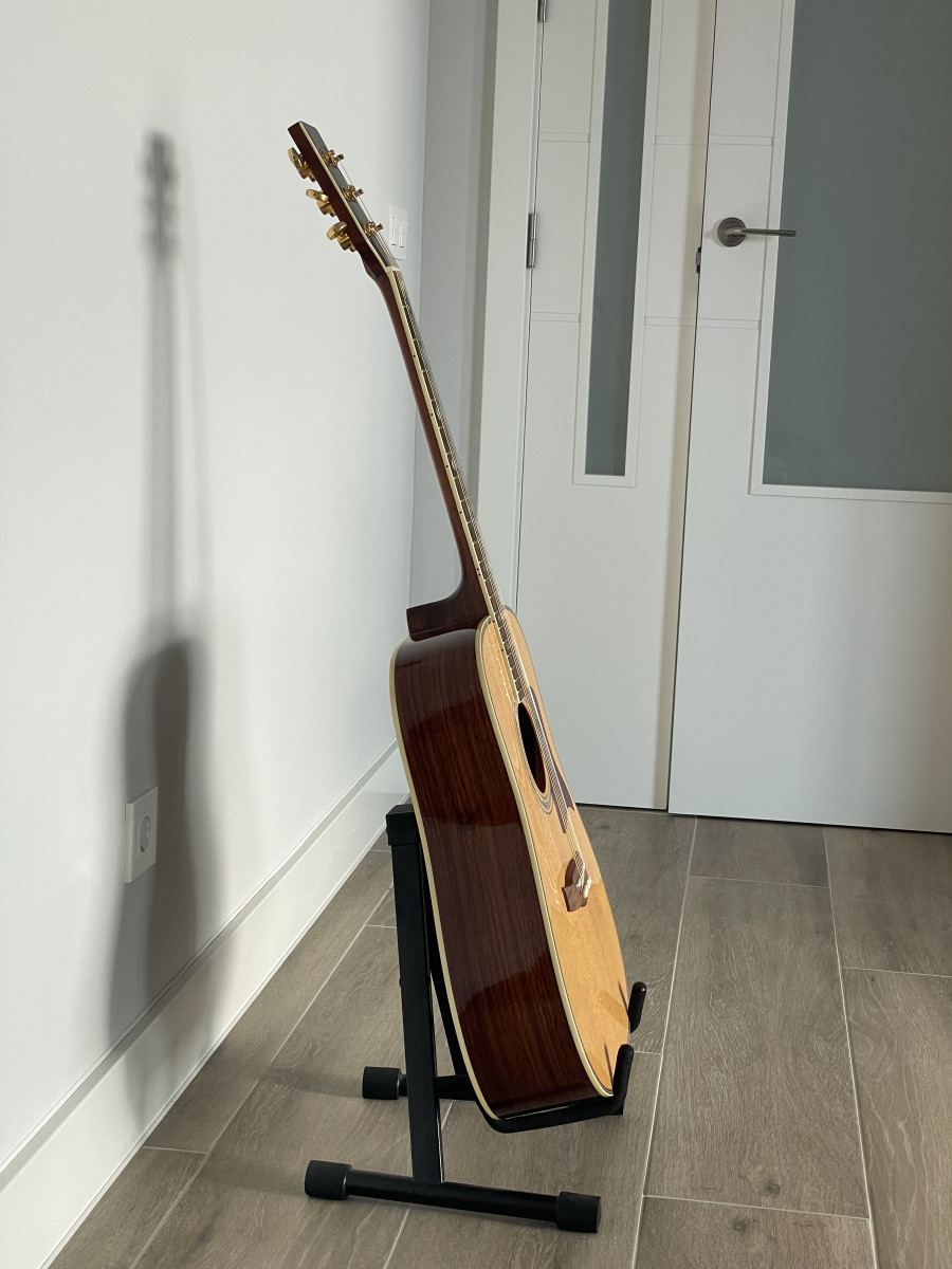 Acústica de madera maciza de 18 años. No está preamplificada. De tamaño dreadnought, tapa de abeto macizo, fondo y aros de palisandro macizo, acabado brillante natural, clavijeros dorados de gran calidad y diapasón decorado con rombos de nácar. Usada obviamente pero muy bien tratada, nunca ha recibido un golpe. Por favor, solo interesados de Madrid.
