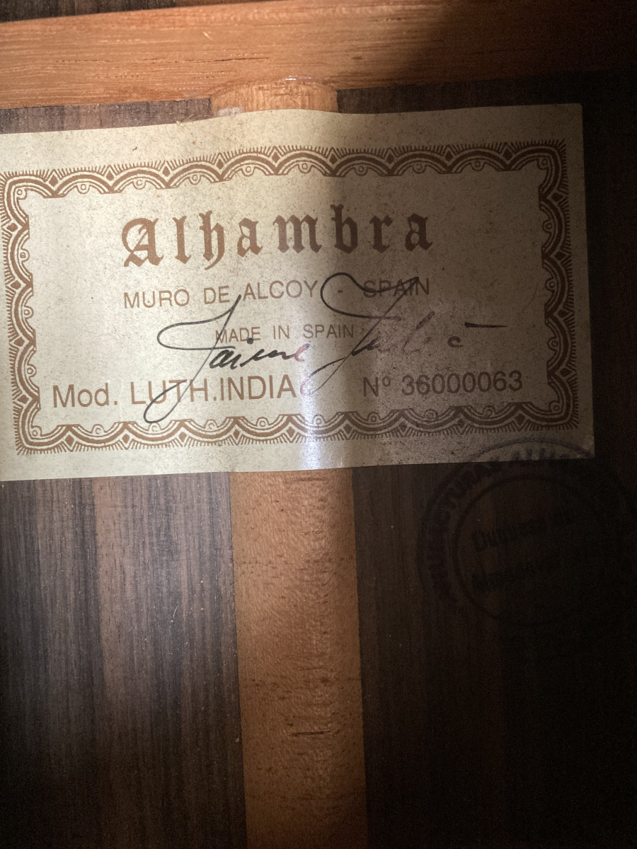Vendo guitarra clasica Alhambra modelo Luthier India de Jaime de Juliá en muy buen estado, algún pequeño roce que muestro en las fotos, pero en general está perfecta, trastes como nuevos, con su estuche original.