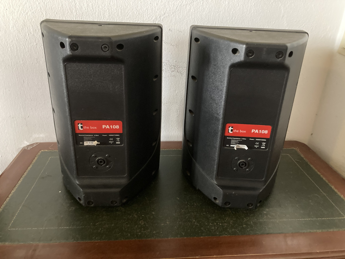Vendo pareja de Altavoces The Box PA 108 en buen estado, con algunos roces del uso pero nada fuera de lo normal. Son de 8 ohmios y entregan 100 Watts RMS cada uno y tienen un excelente sonido.