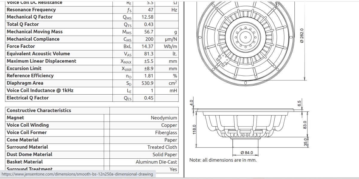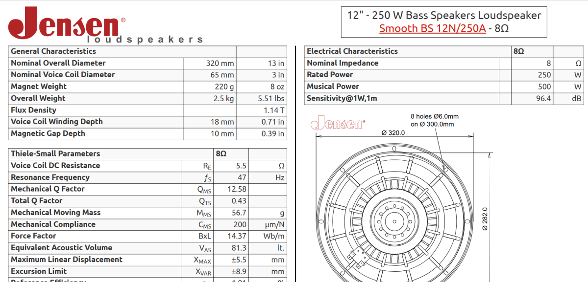Altavoz Jensen Smooth Bass BS 12N/250A de 8 ohm y 250W.Sensibilidad: 96,4 dB.