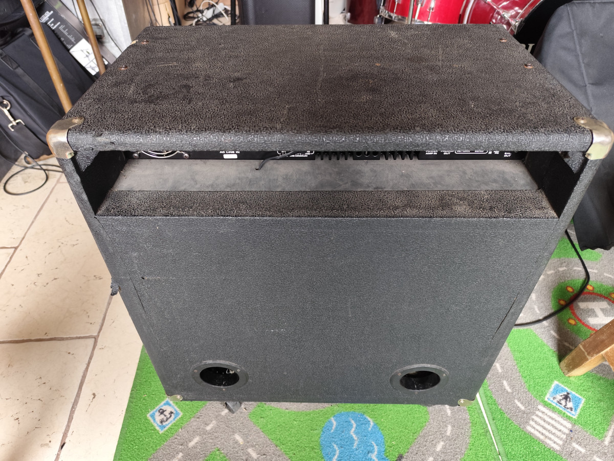 El ampli tiene más mili que la Charito, picadas en el tolex, las ruedas que traía extraíbles, ahora están fijas. Se le cambió también el ventilador.Los botones de plástico de los potenciómetros también están cambiados, sólo los botones. El segundo fader del eq gráfico se partió pero funciona perfectamente. Pero siempre al día en revisiónes. Lo llevé hace dos meses (ya son casi cuatro, pero sin usar desde entonces) al servicio oficial para puesta a punto, y tiene otros 30 años más para dar guerra. Suena como el primer día. El altavoz de 15 pulgadas te da unos graves profundos que suenan a gloria!!!