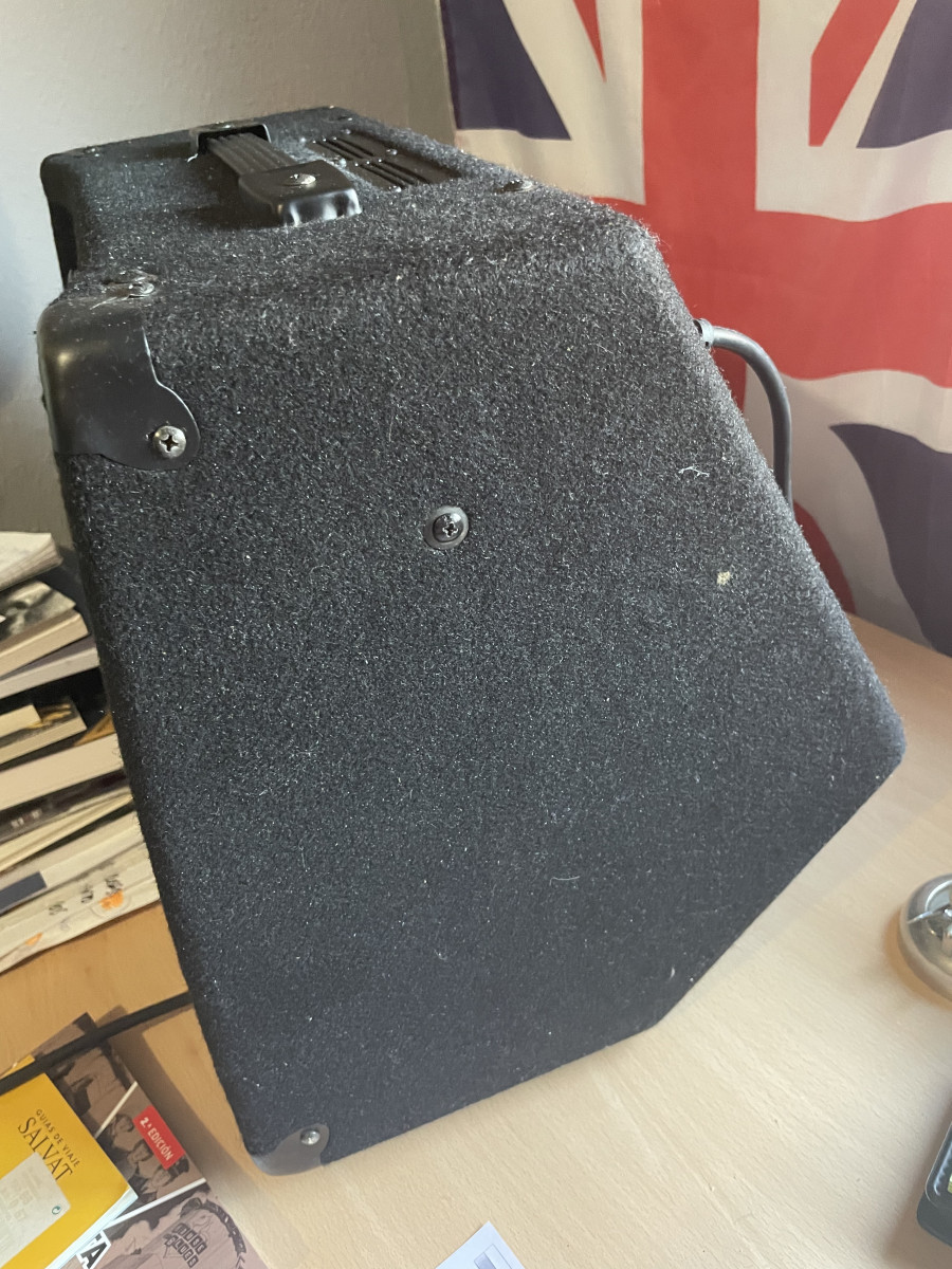 30 Watios,cono de 10’,tweeter driver de alta frecuencia,salida de línea XLR,y compresor incorporado.Entrada normal y hight.Ideal para casa,aunque al poder meterlo por línea,sirve para bolos pequeños.Solo pesa 10 Kg.