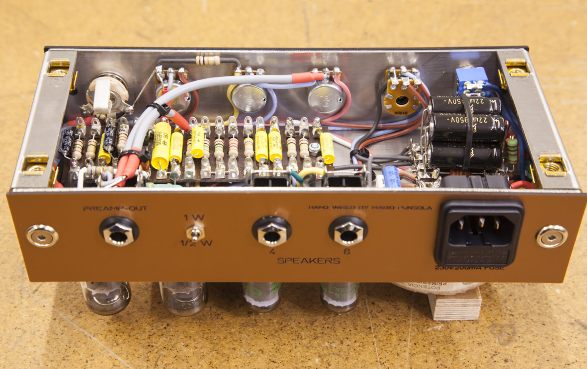Funciona con 2 válvulas 6AK6 General Electric USA en clase A en la etapa de potencia y 2 válvulas 12AT7 en previo.