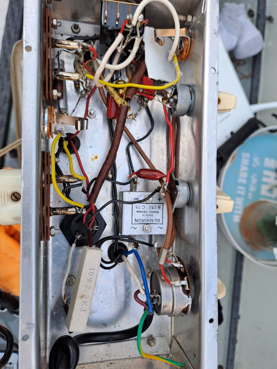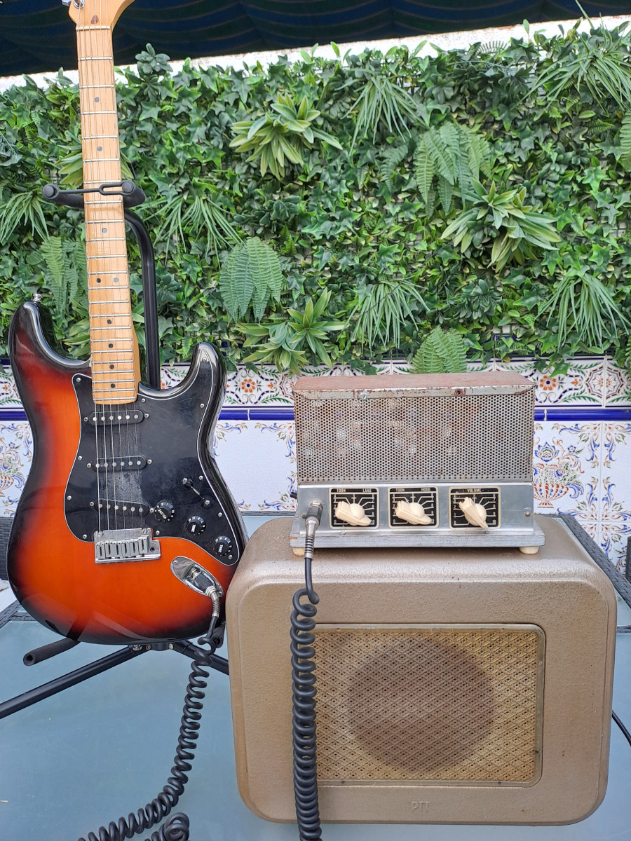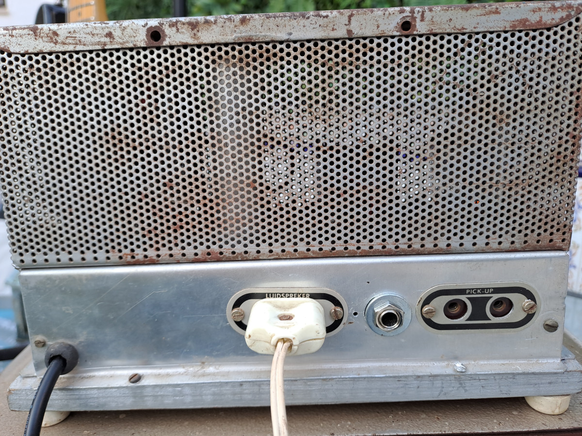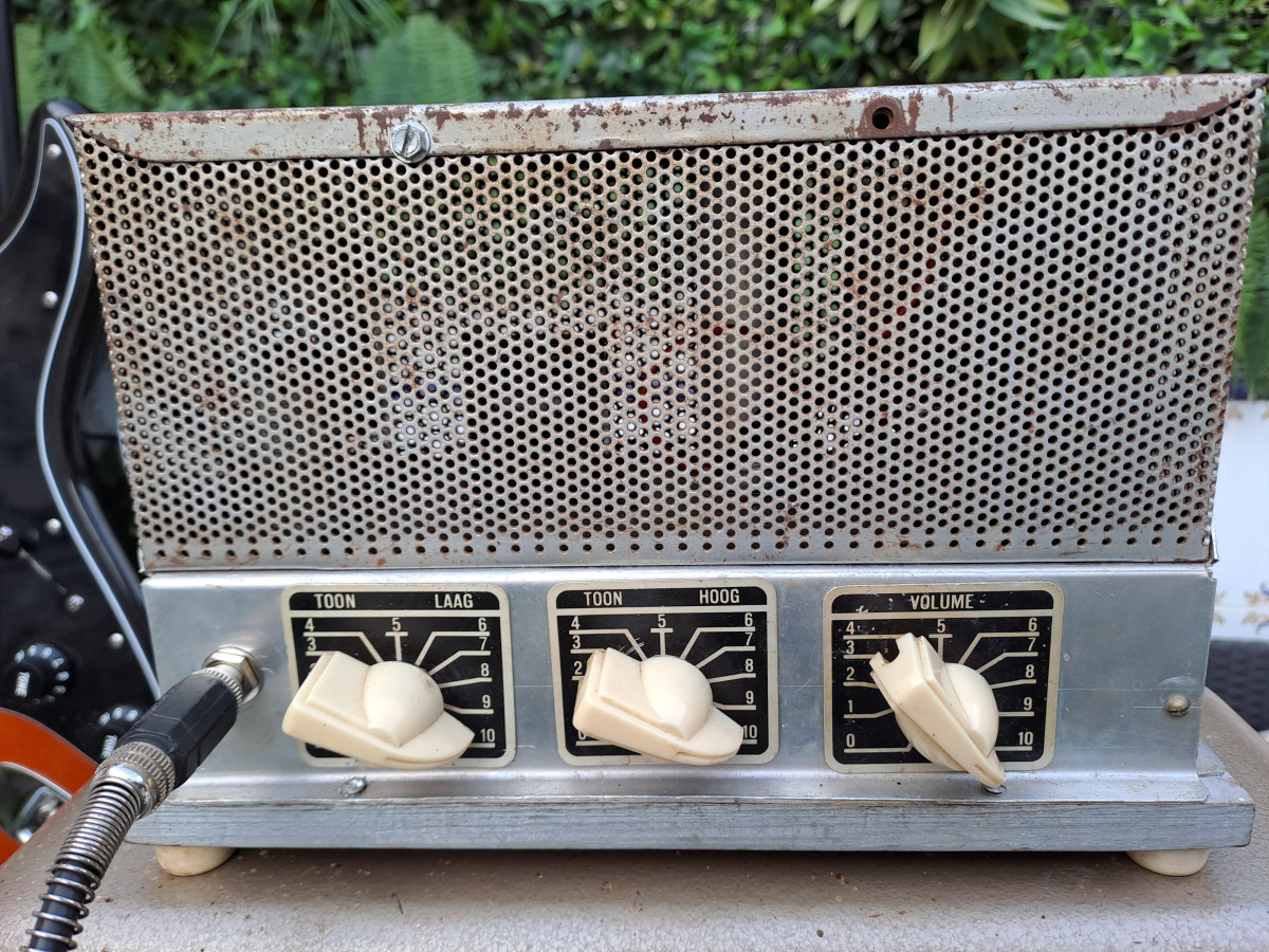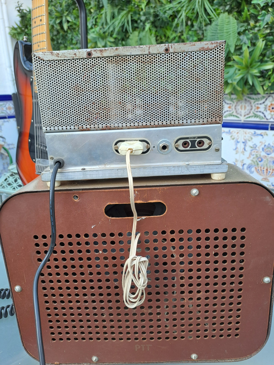 Amplificador artesano hecho en Holanda en los años 60 para tocadiscos/magnetofon adaptado para guitarra eléctrica. Se le han cambiado varios condensadores.