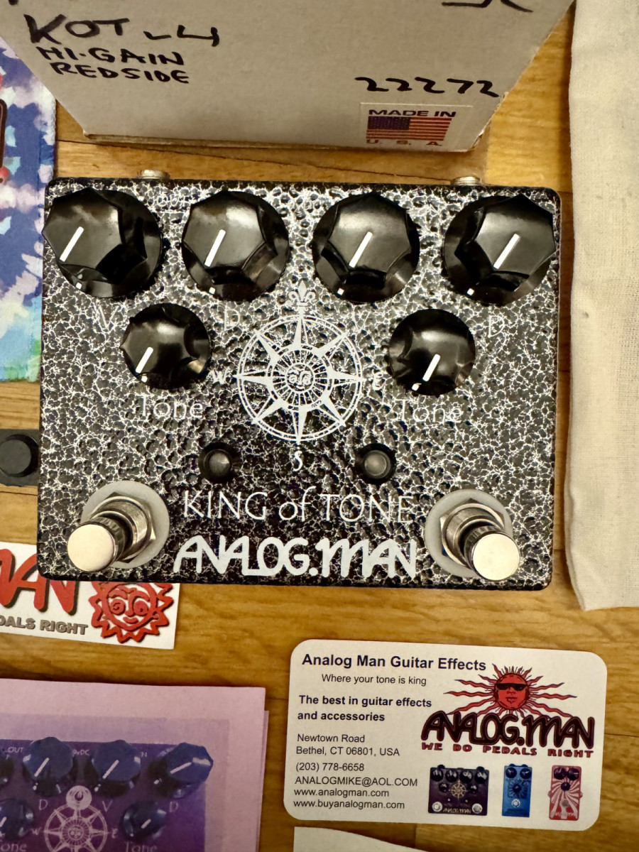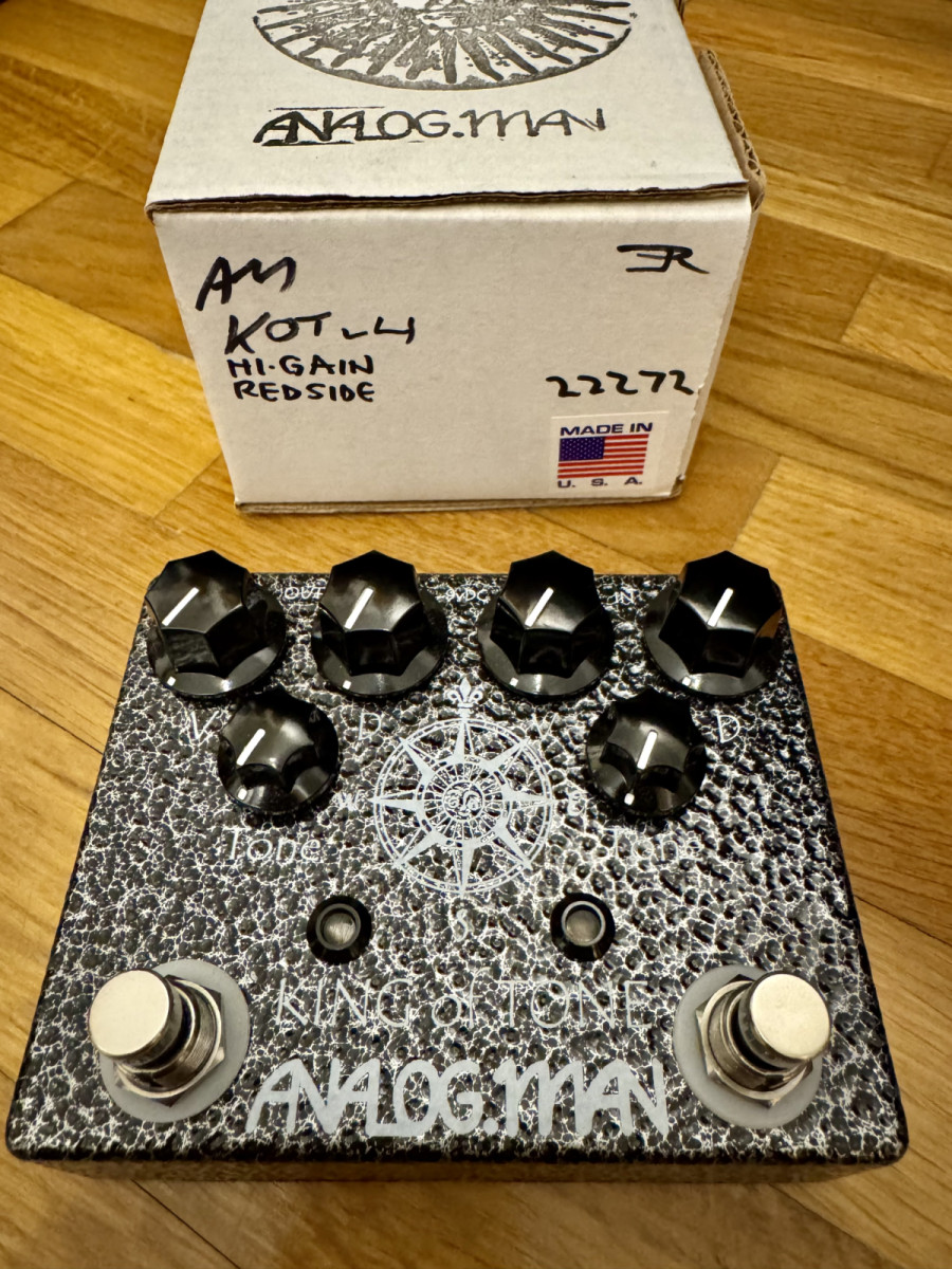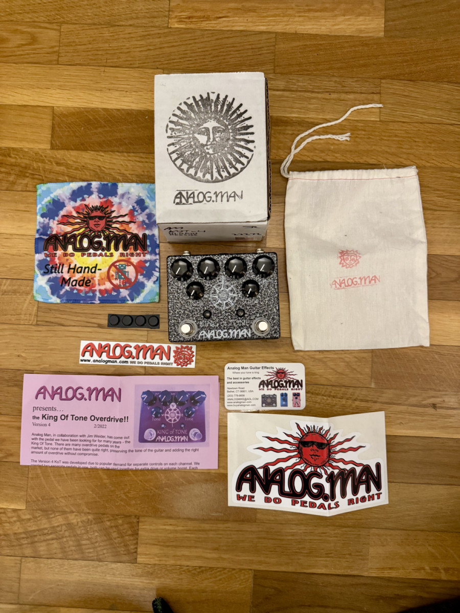 Analogman King of Tone V4 con opción High Gain en el canal rojo. Acabado Black Speckle, impecable, sin velcro ni marcas. Incluye caja, bolsa, stickers, paño tie-dye y documentación originales.