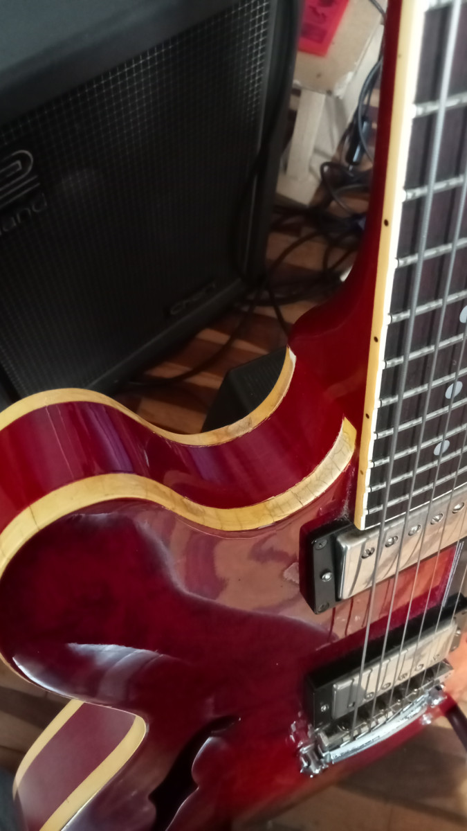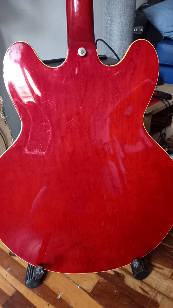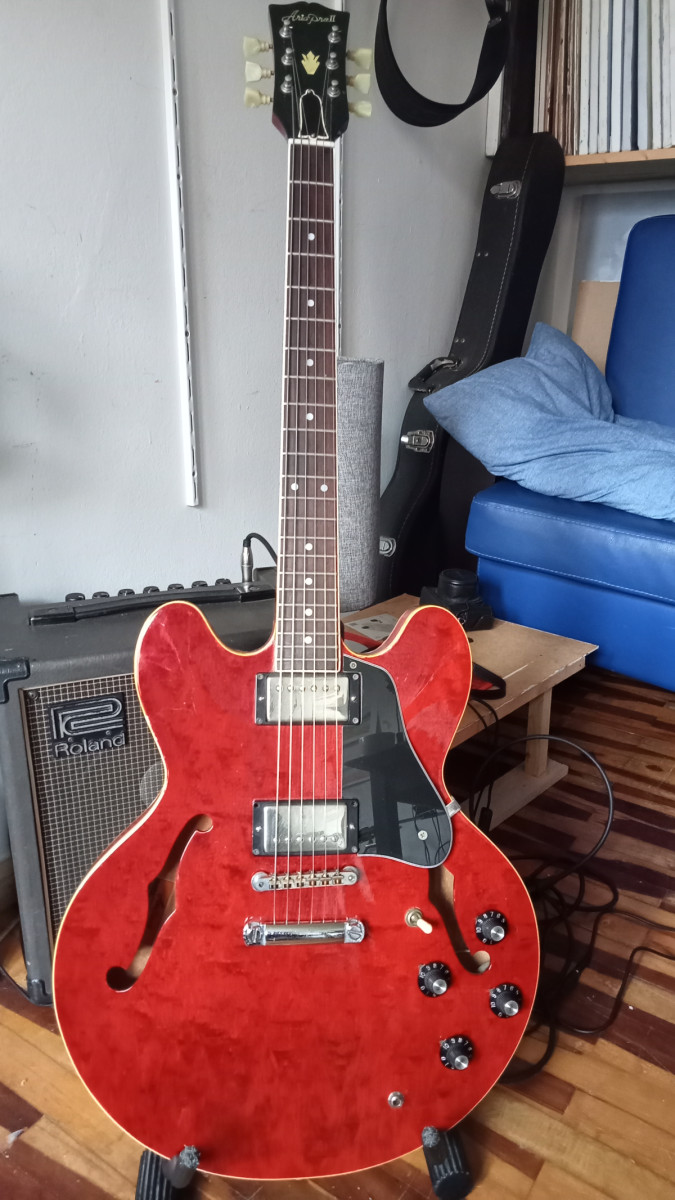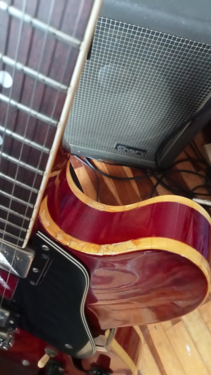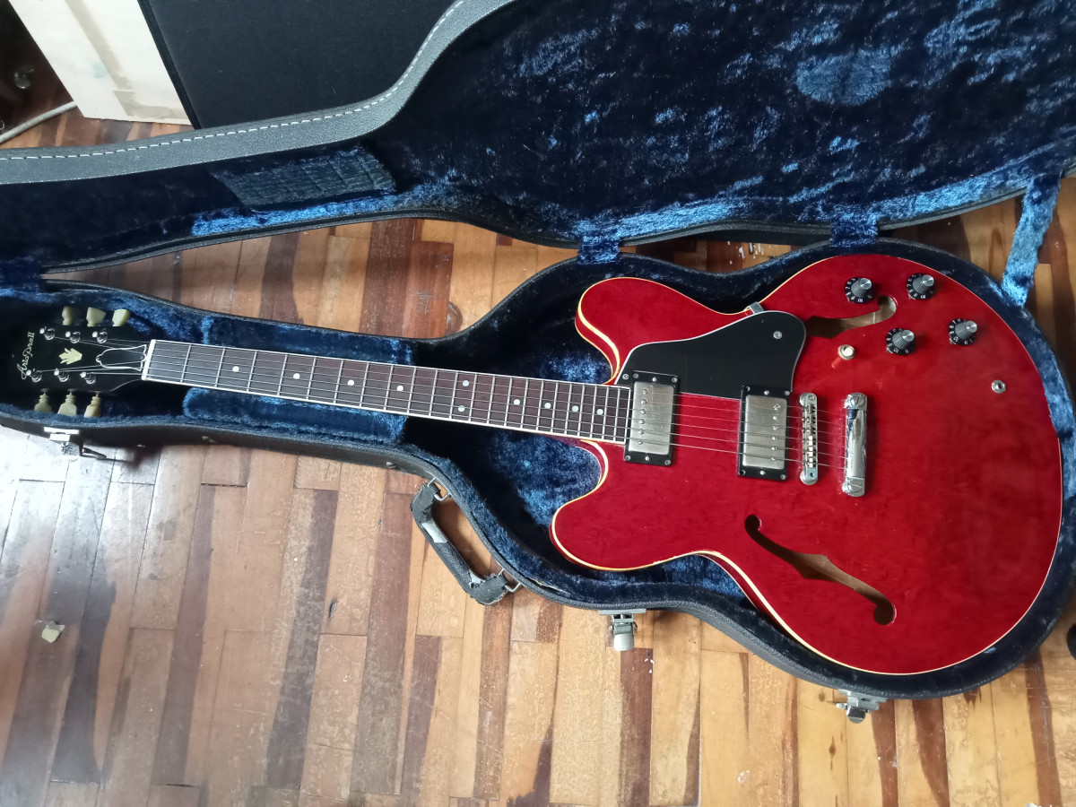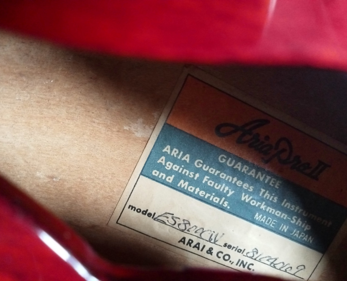 Magnifica semi hollow Aria Pro II Es 800 CW hecha en la mitica Matsumoku Factory en Japon en 1981. LLeva dos humbucker seymour duncan Aph1. Sonido Cálido y equilibrado típico de las es 335. Guitarra muy bien hecha y díficil de encontrar. El binding está craquelado en las zonas de mucho arco como suele pasar a esas guitarras de más de 40 años. Mástil de caoba comodísimo . Trastes con mucha vida por delante. tapa fondo y aros de arce. Cijuela de hueso recien cambiada , hecha a medida por lutier. Recien ajustada por lutier con cuerdas flatwound 12/52.
