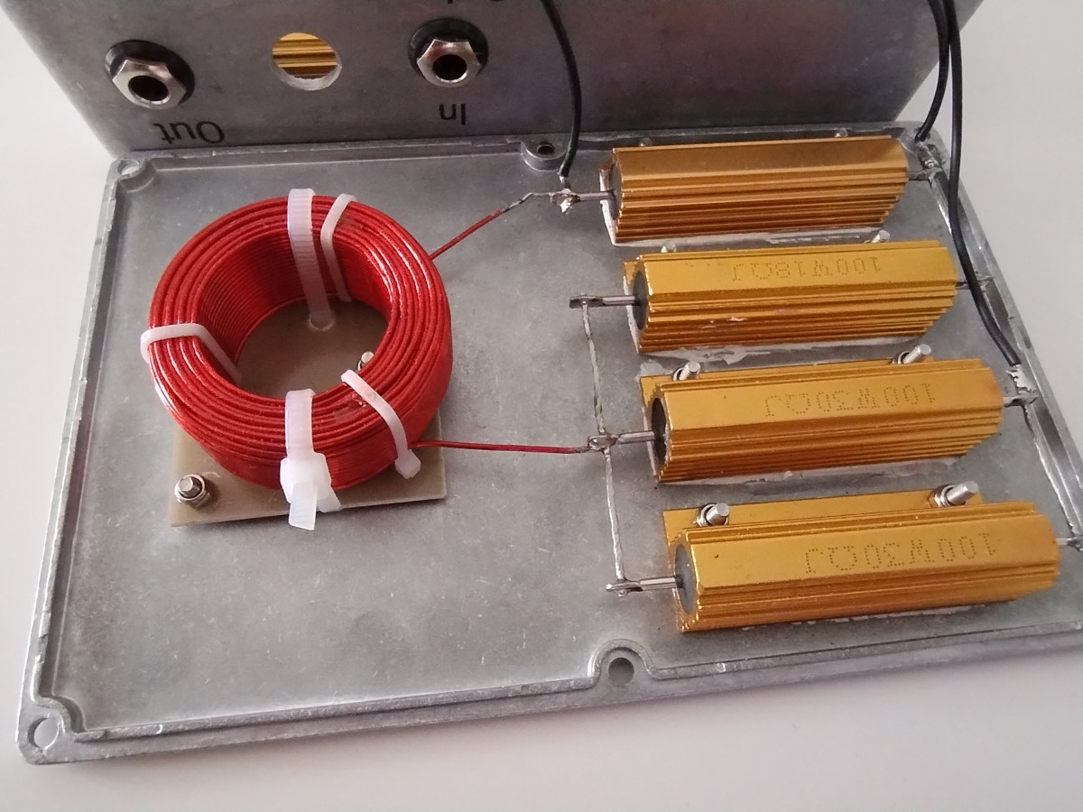 Atenuador reactivo de 100W con una impedancia de 8 ohm. Diseño modelo "M2 JohnH", sin modificación.