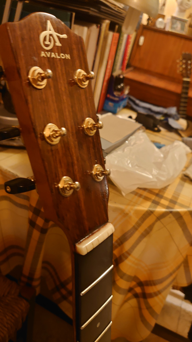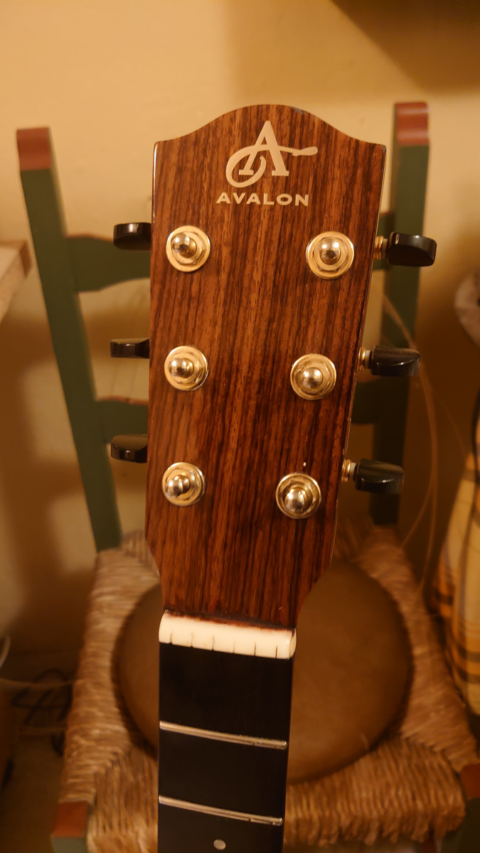 Guitarra artesanal Avalon/Lowden A-101 (Gold Series) hecha a mano en Irlanda. Número 125 de la serie, 2002. Toda maciza, tapa Cedro selecto, aros, fondo y mástil de Caoba americana maciza. Binding de Peral. Diapasón de Ébano. Adornos en tacón, clavijero, también el puente, Palo Santo.