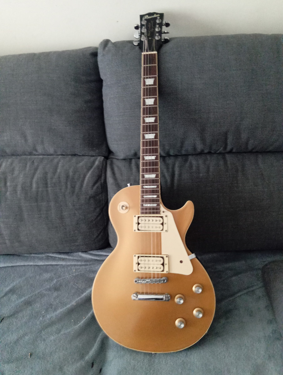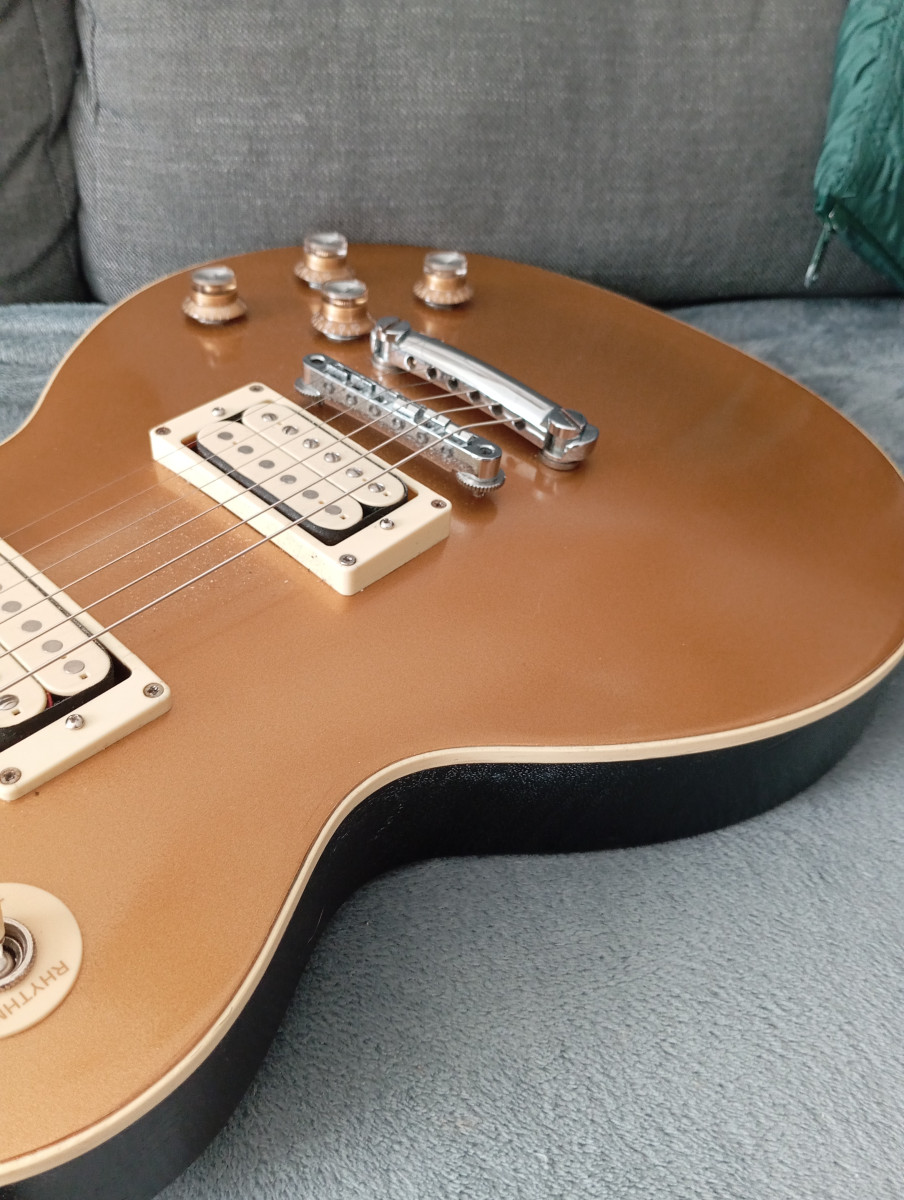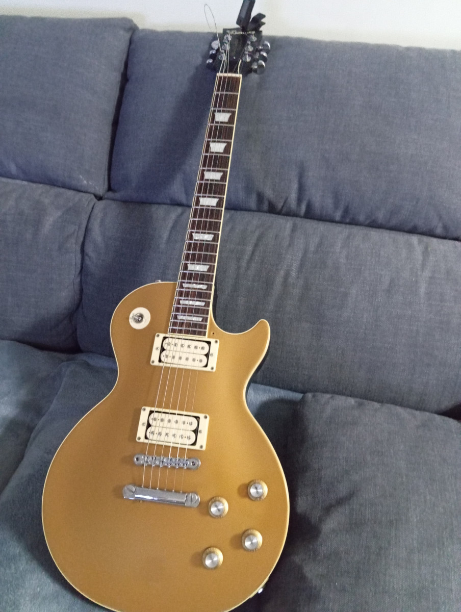 La tapa de arce pintada en Gold Top (Nitro).De serie venía acabado en aceite toda ella.Por eso en muchas partes negras se ve la madera, por el desgaste del uso..Mas de 400 euros en mejoras.Electronica Mojotone Premium Historic.Pastillas B&B. Late 50 bobinadas a mano.Puente Gotoh.Peso 3,7Kg.Va con funda genérica .