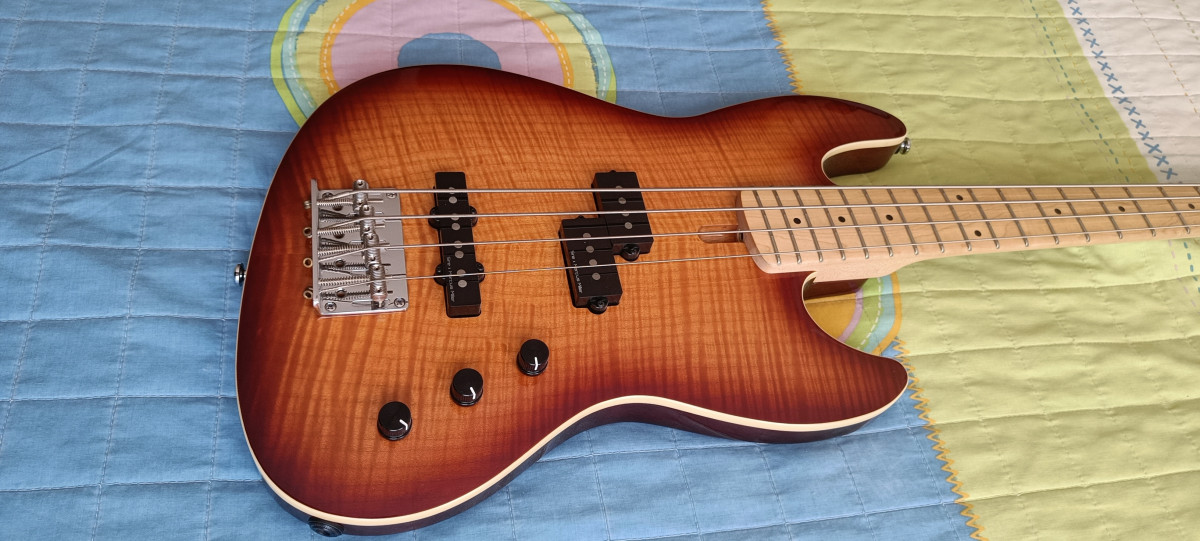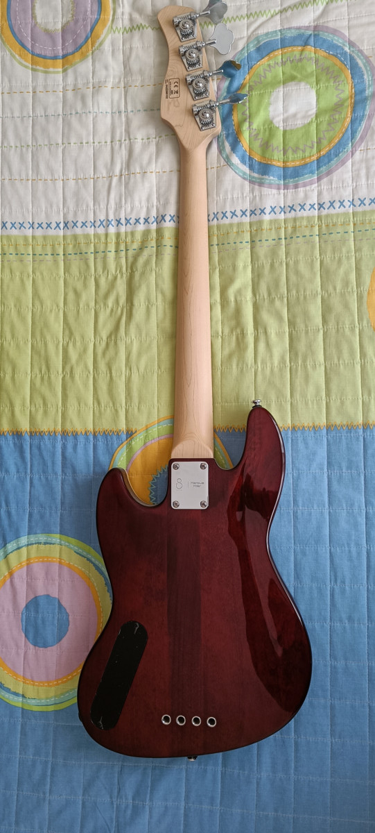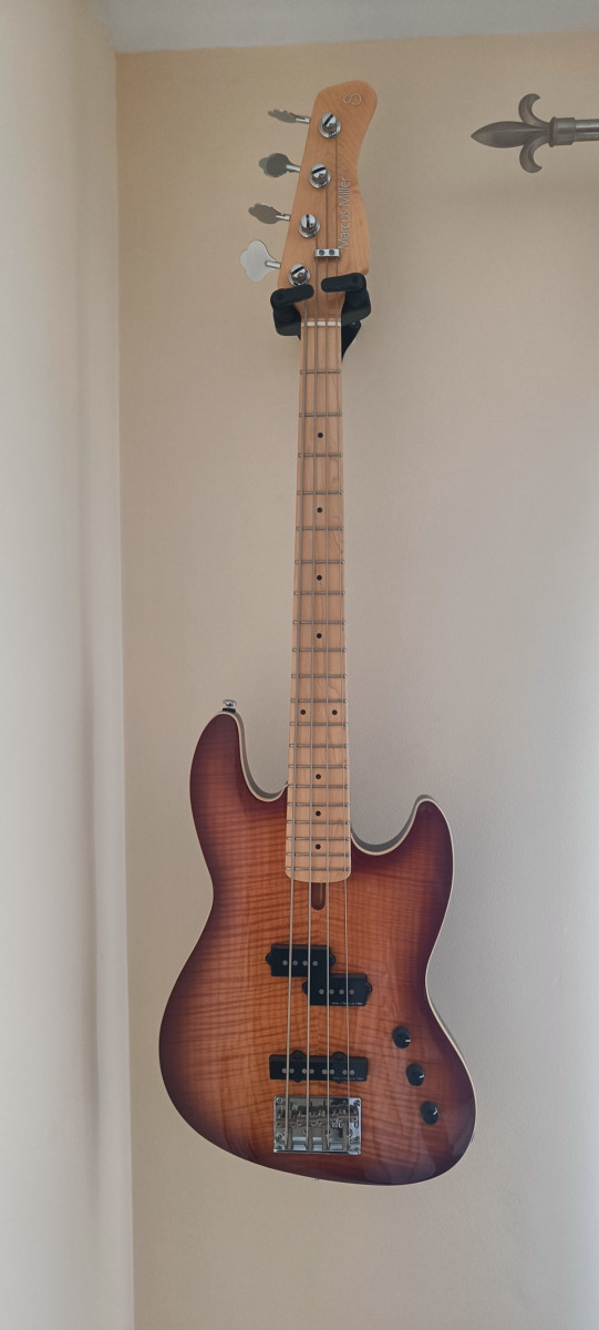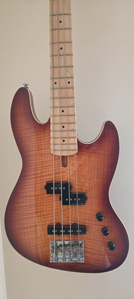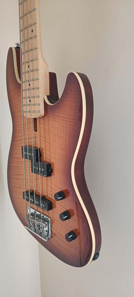Escala corta, Fabricado por Sire, Cuerpo de aliso, Tapa de arce flameado, Mástil de arce con perfil en 'C', Diapasón de arce, Longitud de la escala: 762 mm (30"), 20 trastes Medium Jumbo, Anchura de la cejilla: 38 mm, Pastilla Marcus Super Jazz (puente), Pastilla Marcus Super Precision (mástil)