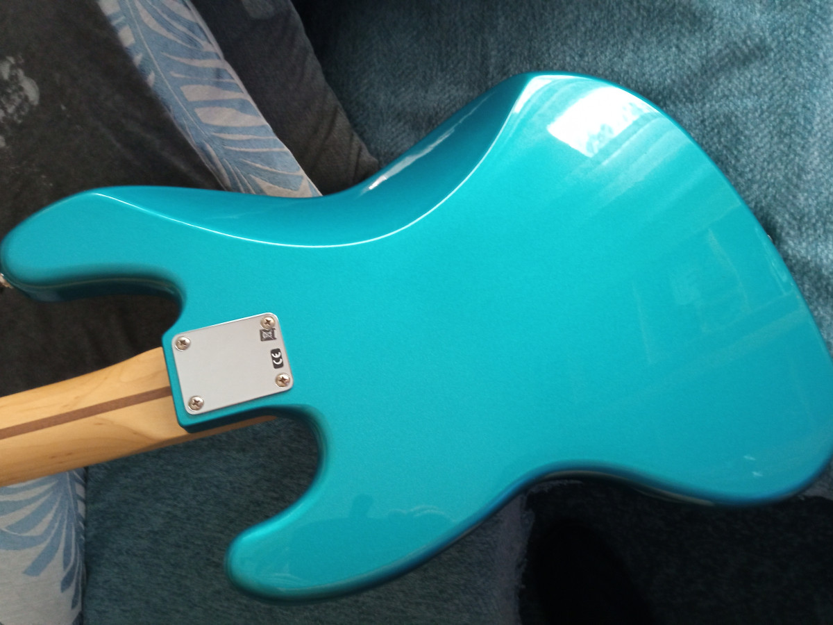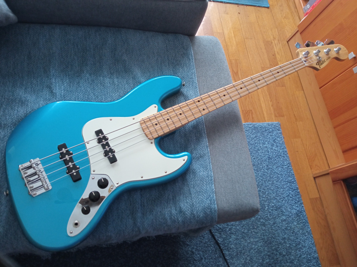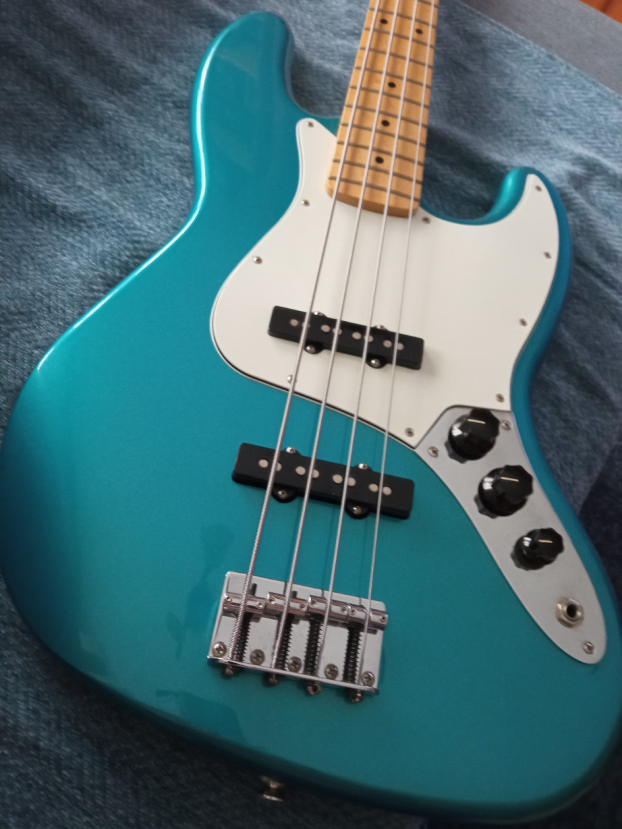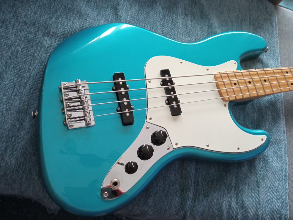 Vendo bajo Fender Jazz Bass, hecho en México en 2017, color Lake Placid Blue. Perfecto estado, sin marcas ni golpes.