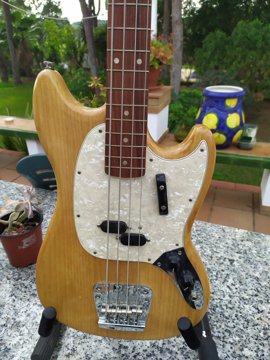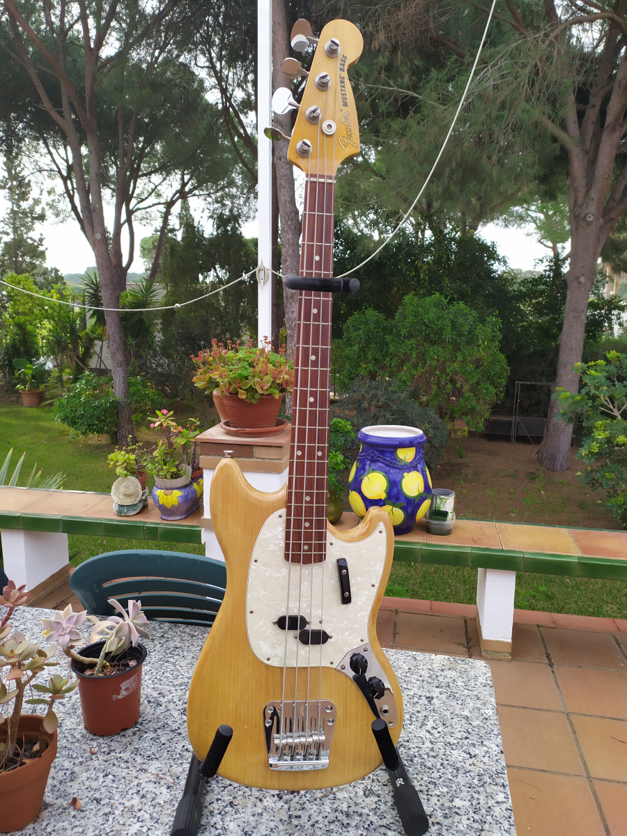 Bajo Fender Mustang Vintera de 2019 (ver descripción n°serie) ; perfectamente ajustado, y ajustable al gusto, a toda prueba, sonando precioso; muy cuidado; le quité el acabado su sunburt q traía, horrible y plasticoso, y le di nitrocelulosa; doy tb funda acolchada de las buenas y juego de cuerdas lisas, de jazz.