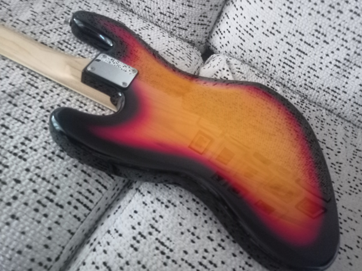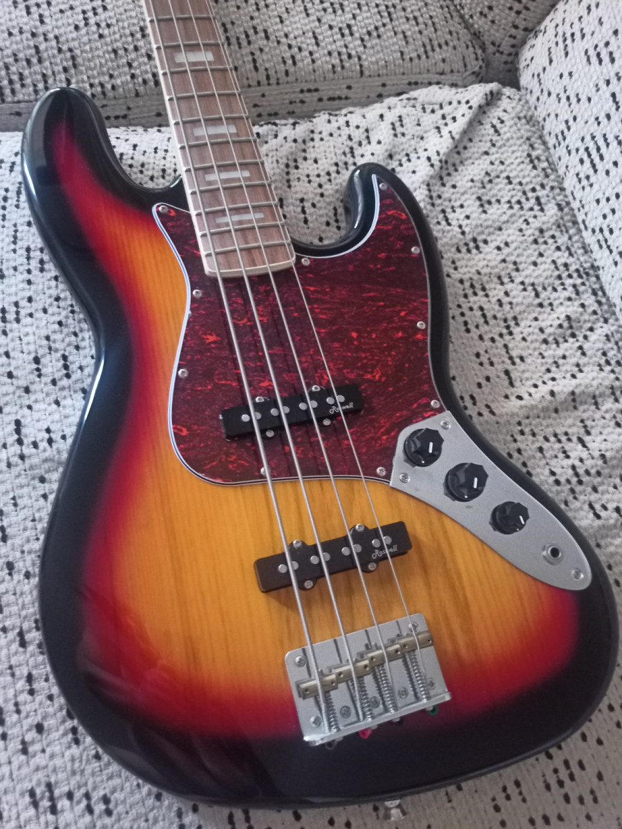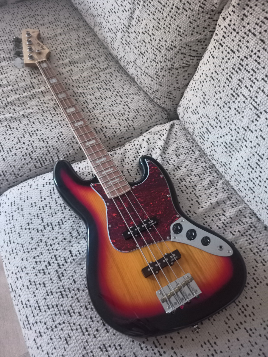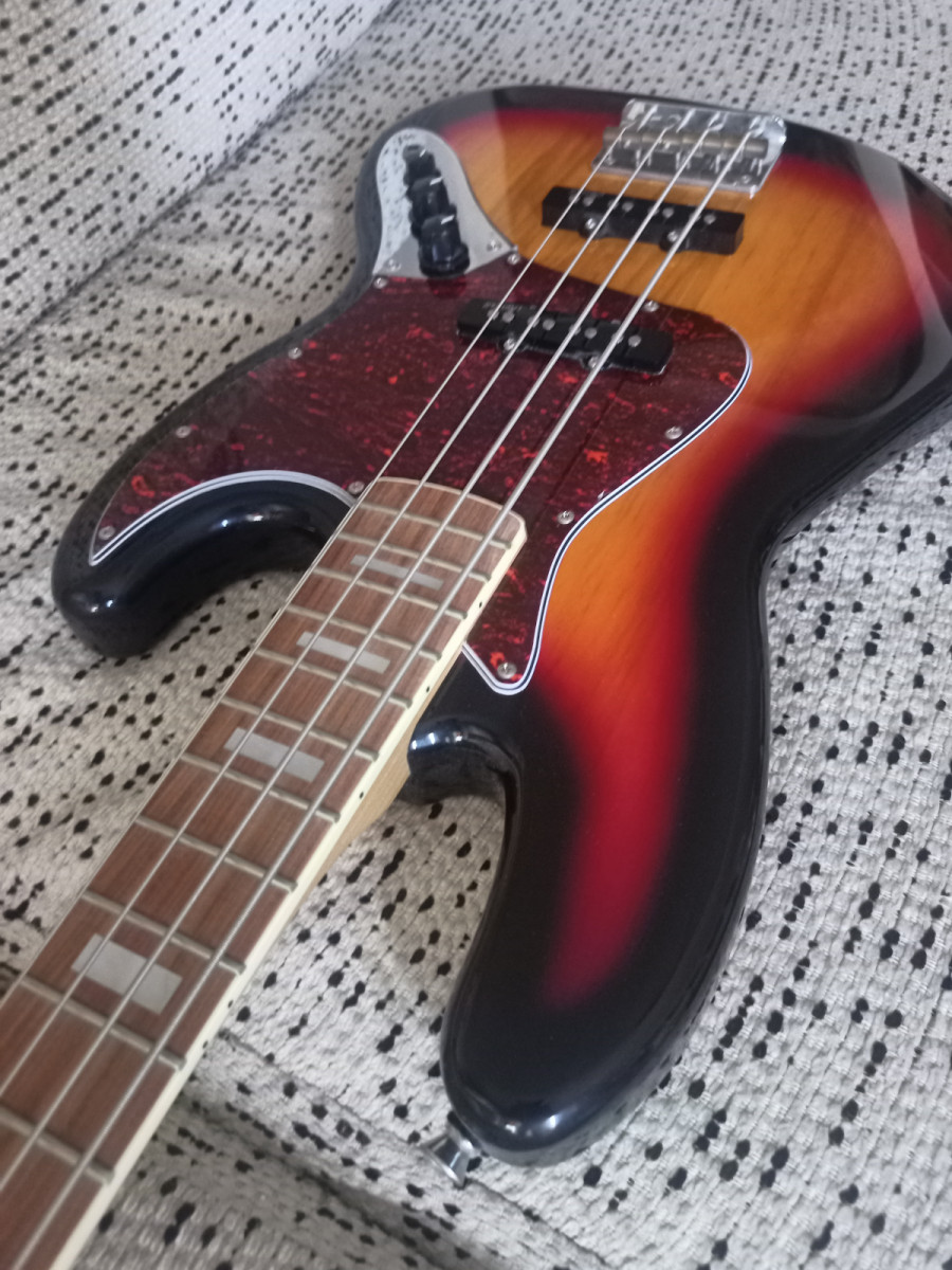 Estética tipo Fender Jazz Bass con acabado 3-Tone Sunburst, cuerpo de fresno, mástil de arce con diapasón de amaranth y bloques blancos estilo vintage.