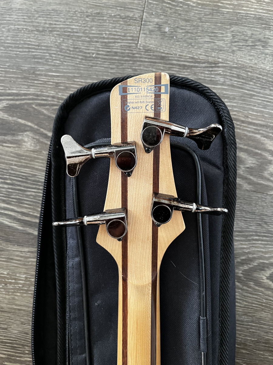 Bajo eléctrico Ibanez SR300 en muy buen estado. Tiene un mástil comodísimo. Todo ajustado. Presenta alguna pequeña marca de uso.