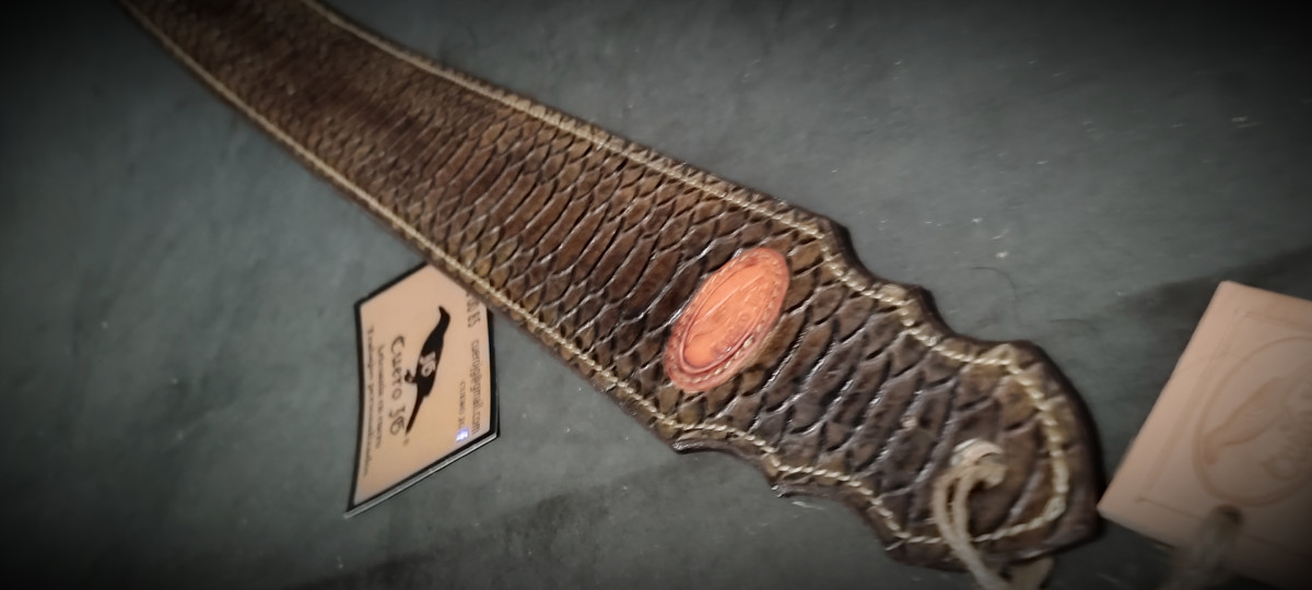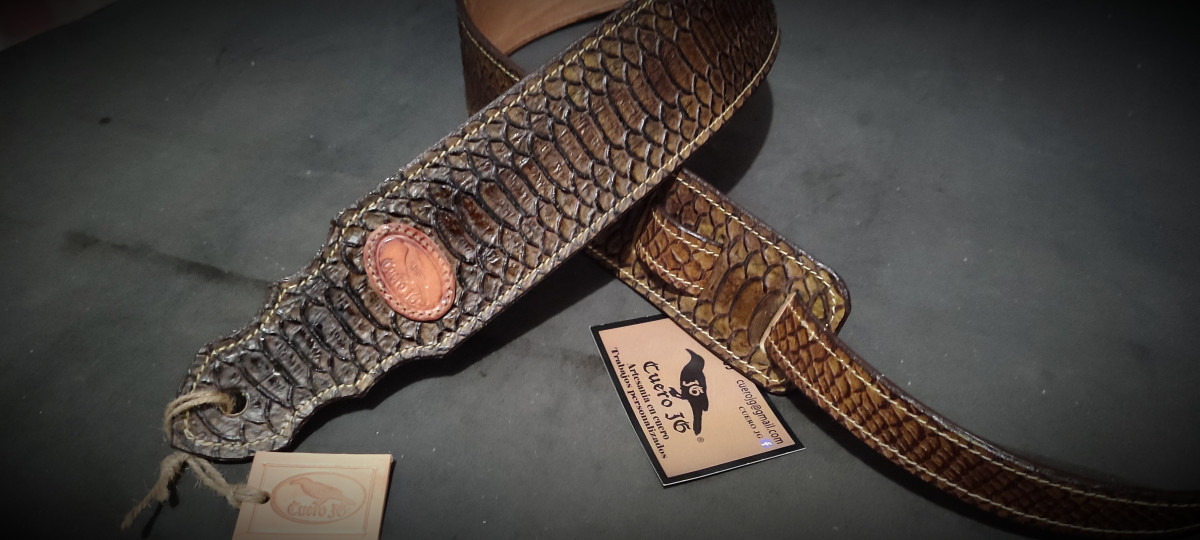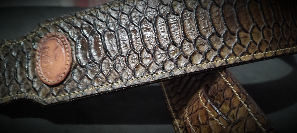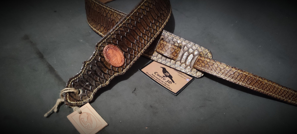 Bandolera realizada en vaquetilla de 4 mm y vacuno con patrón de Pitón.