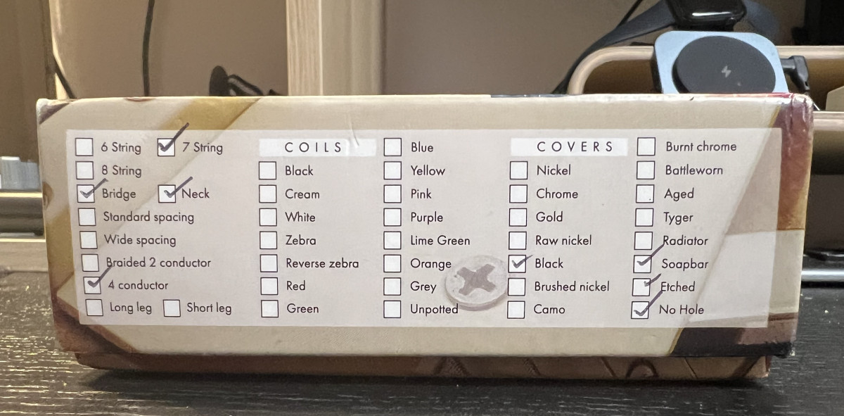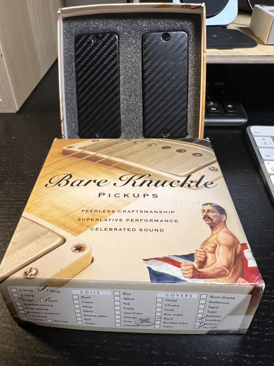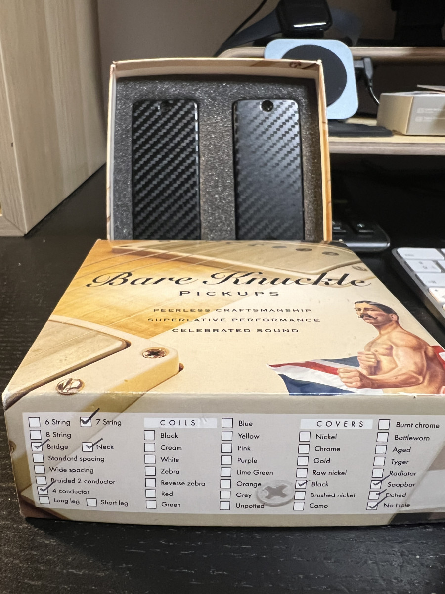 Vendo set de pastillas Bare Knuckle Juggernaut 7 cuerdas, Soapbar y acabado Carbon Fibre Tattoo. Montadas muy brevemente (Días) en una Schecter de 7 cuerdas, probadas en entorno de home studio y desinstaladas posteriormente para volver a montar el set original Fishman Fluence con motivo de la venta de la guitarra. Sonido brutal, claridad quirúrgica y graves definidos. Las pastillas están como nuevas. 4 conductores por pastilla: permite splits, serie/paralelo y mods personalizadas.