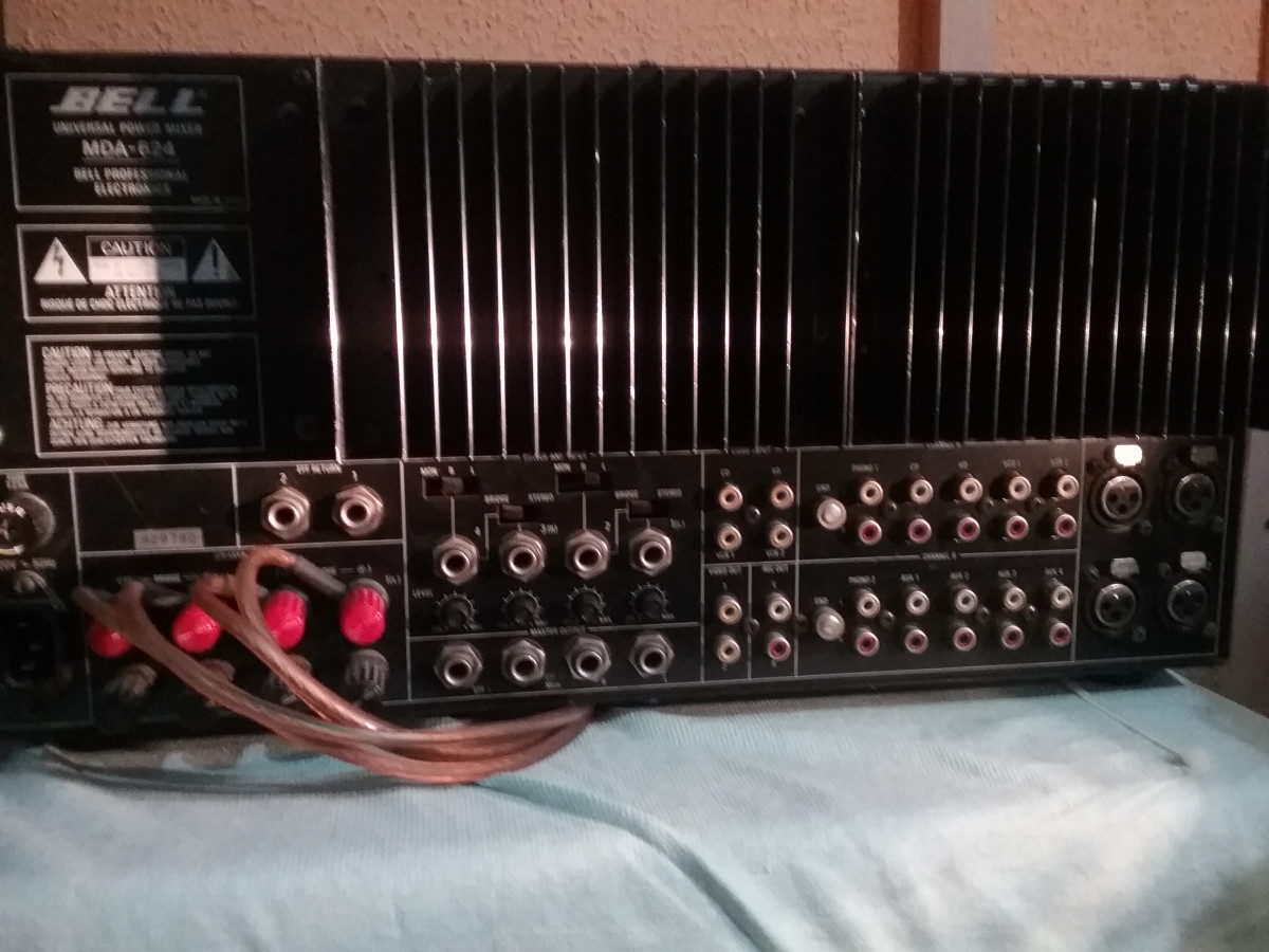 Mezclador auto amplificado BELL MDA 624, ideal podcast-radio-monitor-disco movil. 300W 8ohm, 6 canales, croosfader en 5 y 6 ( con 10 entradas seleccionables ), delay digital, monitores, imputs 4 XLR trasera, varias salidas y entradas, 150 W por 2 salidas, o 75 W por 4 salidas.