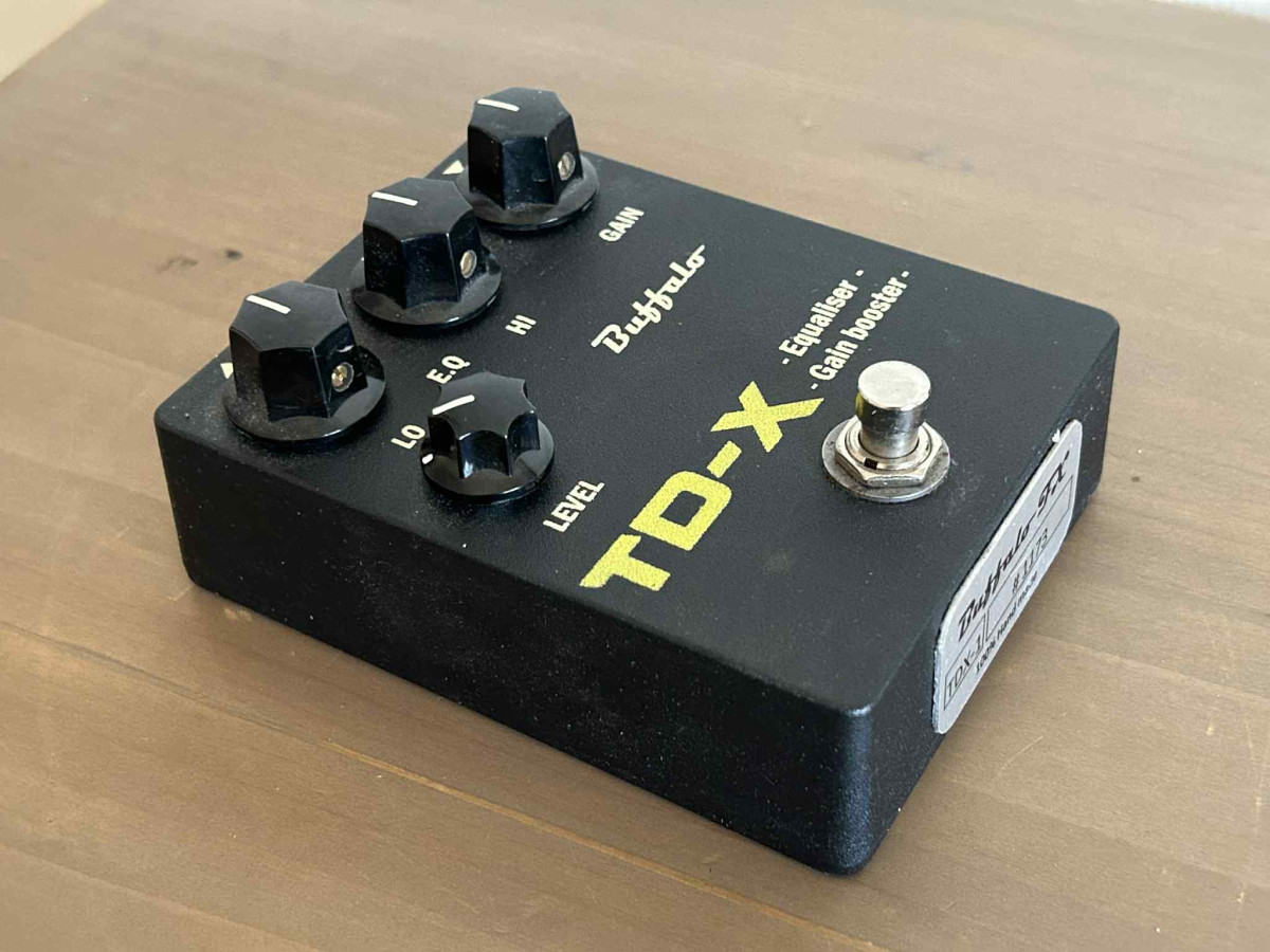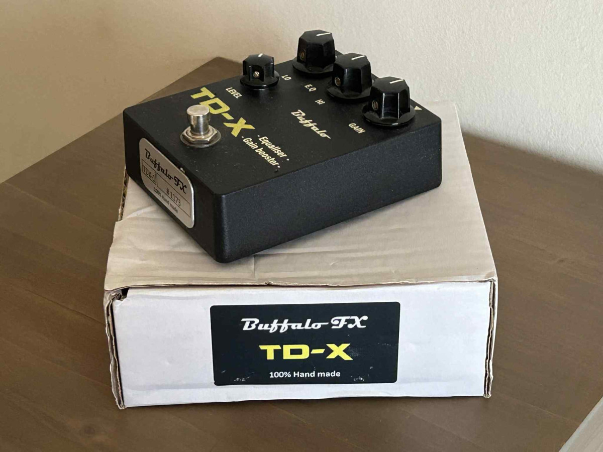 El Buffalo FX TD-X es un pedal ecualizador/amplificador de ganancia hecho a mano diseñado con componentes de alta calidad y una verdadera funcionalidad de derivación. Cuenta con ganancia, controles de nivel, graves y agudos, junto con tomas de alimentación y señal de montaje superior. El pedal está equipado con un LED regulable de baja corriente y requiere un centro de 9V fuente de alimentación negativa o batería de 9V para su funcionamiento. Sus dimensiones son 120 x 95 x 35 mm (4,7 x 3,7 x 1,5 pulgadas) solo para la carcasa. El TD-X es conocido por su fiel réplica sonora de un conocido pedal accionado por válvulas, con un ecualizador de dos bandas ajustado para reducir la aspereza y la efervescencia a volúmenes más bajos. Además, ofrece espacio adicional para la cabeza, lo que permite su uso como limpiador. boost para empujar un amplificador de válvulas a su punto óptimo o para producir overdrive musical para Un tono natural en una plataforma limpia. El pedal está fabricado en Francia y es un versión renovada del BK Butler Tube Driver.