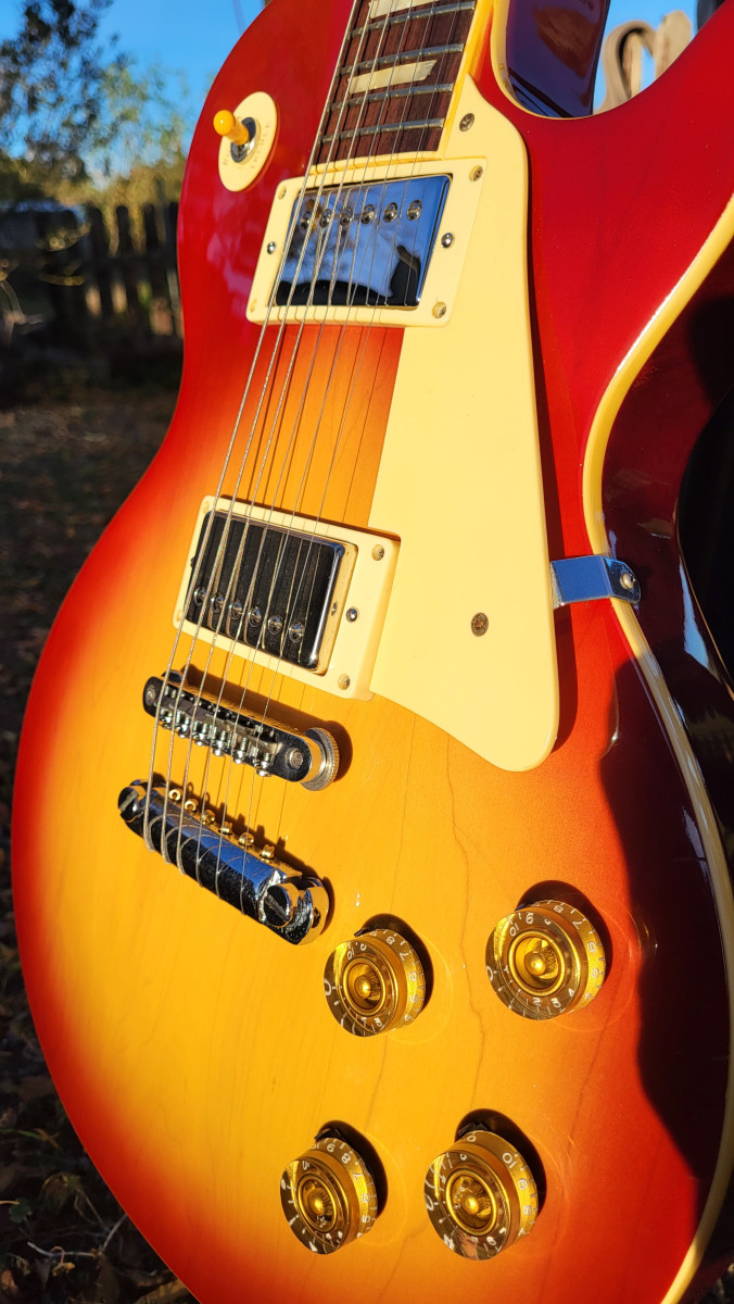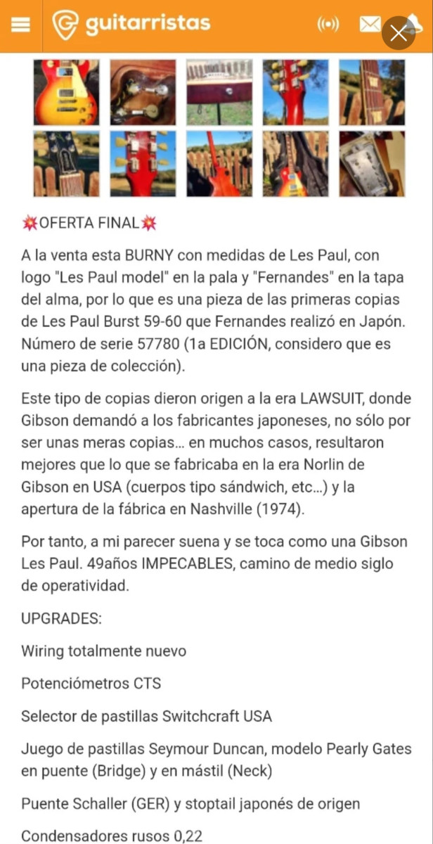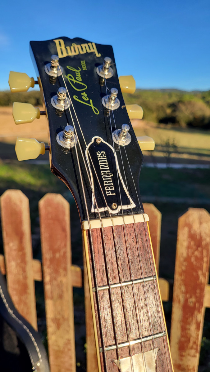 BURNY "Les Paul model" y "Fernandes" en la tapa del alma = PRIMERA tirada de las famosas copias de las Burst 59-60 con mástil encolado (Fernandes, Japón) sn57780