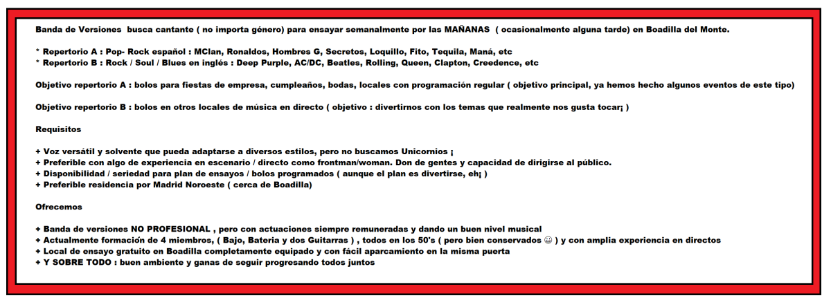 Se busca Cantante con disponibilidad para ensayar entre semana por las mañanas. Normalmente 1 vez a la semana en Boadilla del Monte. Para cantar versiones en español e inglés. Tenemos local de ensayo totalmente equipado. La idea es pasarlo bien y hacer conciertos de vez en cuando. Versiones de rock, pop, blues. Un poco de todo. Se piede seriedad y compromiso.