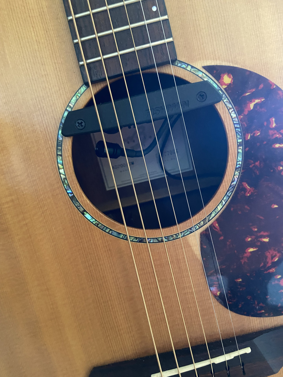 6) Amplificada con una pastilla Fishman Rare Earth Mic Blend, que -ojo- suena mejor y mucho más natural que el sistema de amplificación que trae mi nueva guitarra LRBagss VTC y mejor que cualquier sistema de amplificación que haya probado.