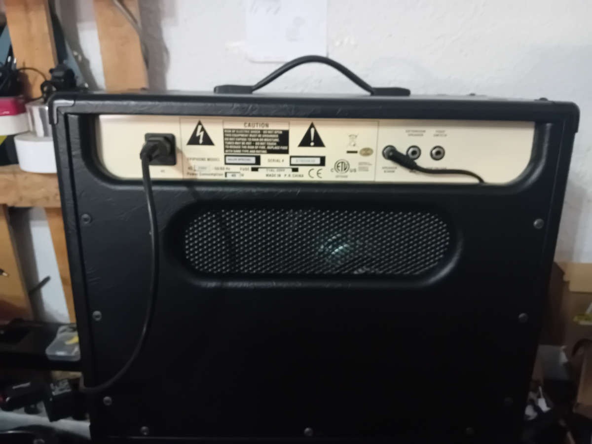 Tiene un altavoz de 10" (8ohm), desconozco el modelo (tiene un logo de Epiphone detrás) y suena francamente bien. Es fácil encontrar tu sonido. El asunto es que para ensayar con la banda, se queda pelín corto, y prefiero un Laney de 15W que acabo de pillar. Para el ensayo casero es perfecto. Buen sonido clásico y calentito de válvulas, tolera muy bien los pedales y volumen razonable