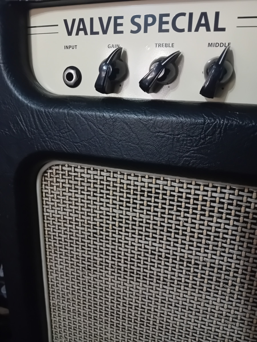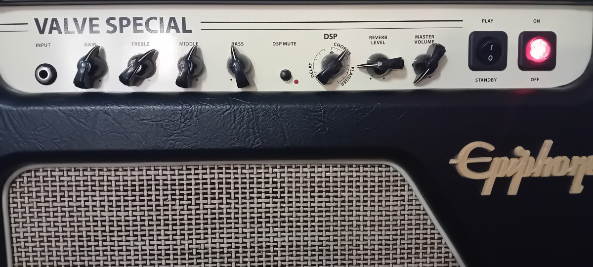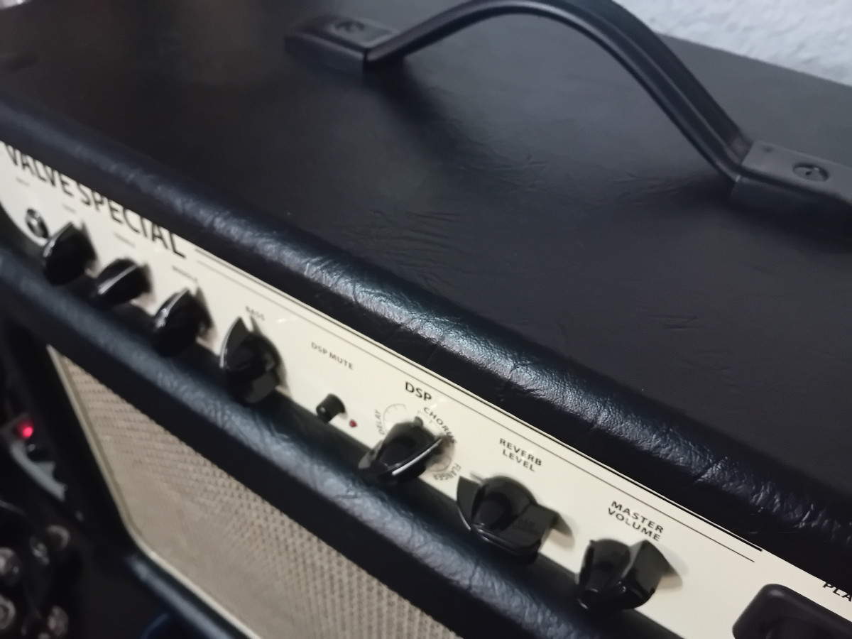 Pues eso, vendo este precioso combo de 5W muy utilizable en casa por eso, los 5W y los controles de Gain y Master, los botones de agudos/medios/bajos, potenciómetro de Reverb, además de un pequeño procesador de efectos en el que puedes elegir, mediante un selector circular, entre Delay, Chorus y Flanger. Para ser francos, yo no he usado esa sección, salvo para comprobar que funciona (y lo hace)