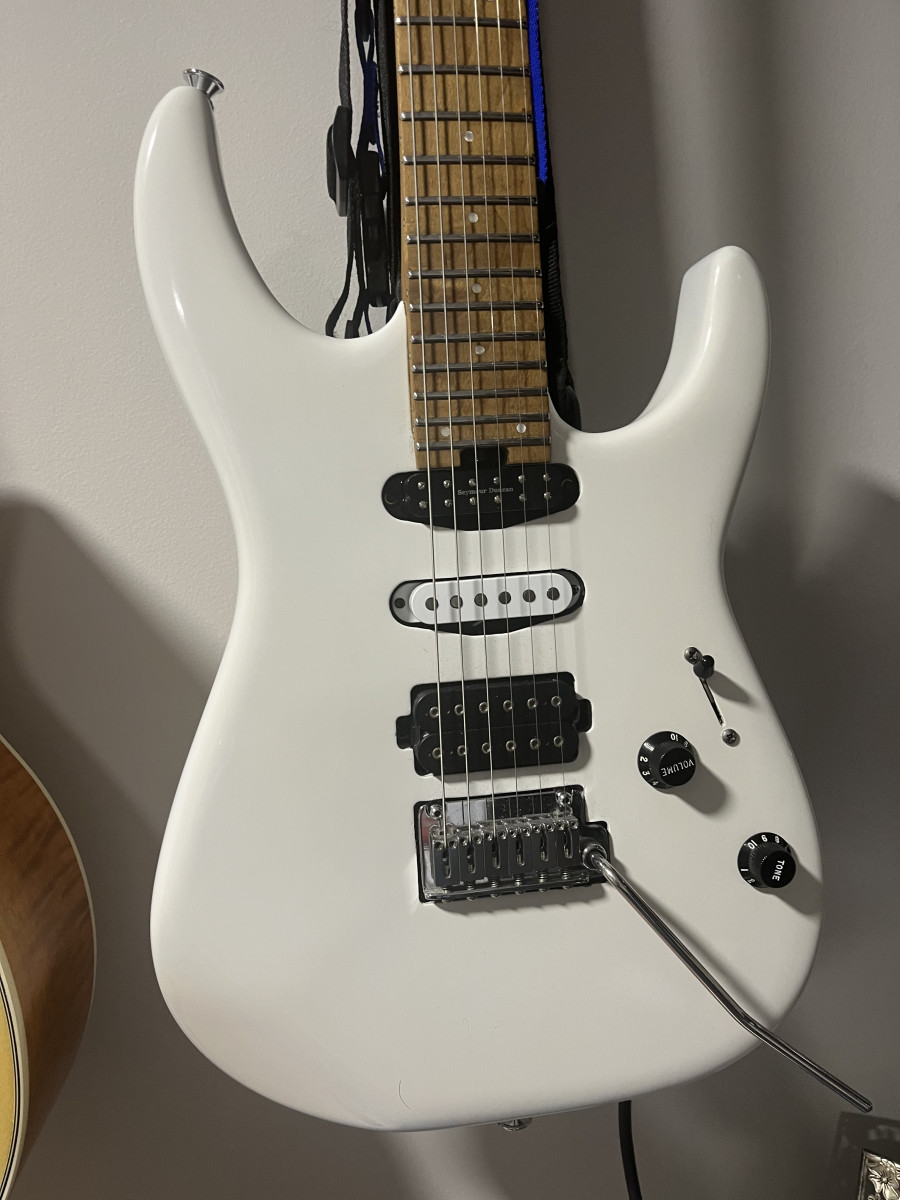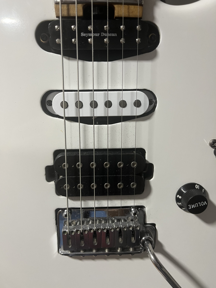 Entre otros mejoras lleva la pastilla del mástil que es una Seymour Duncan 59 Litle. La del puente y centro son las Seymour Duncan que trae de serie. Lleva push-pull para pasar ambas Humbucker a Single. Se le ha cambiado la cejuela por una de hueso. Se le cambiaron los trastes por unos de acero (para mí, es la mejor mejora). La guitarra era azul y se pintó en color blanco y ha quedado preciosa. Se le han limado un poco los bordes de la guitarra y se le han redondeado para que sea más cómoda de tocar, tanto de pie como sentado. Tiene la acción súper-baja y es cómoda no, lo siguiente. Suena espectacular, por no hablar de lo bonita que ha quedado.