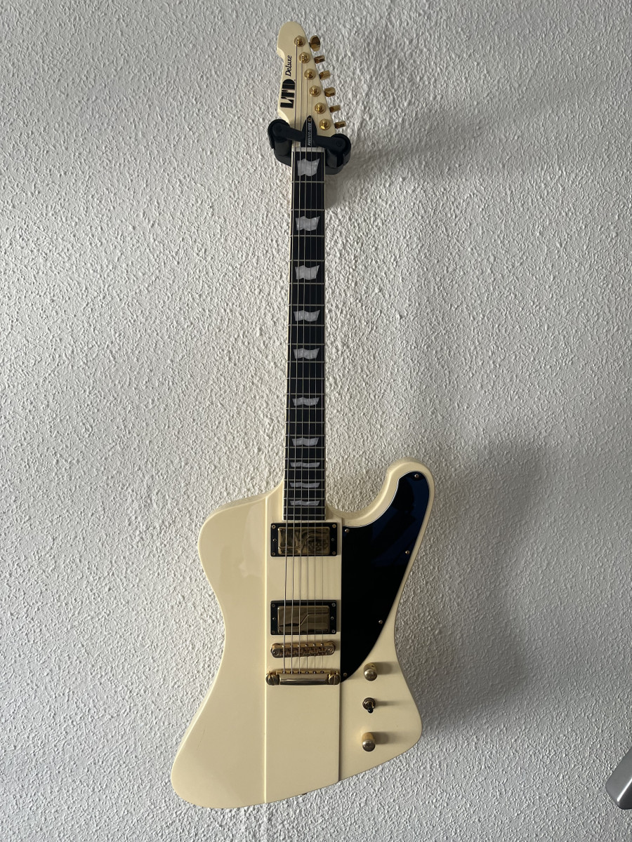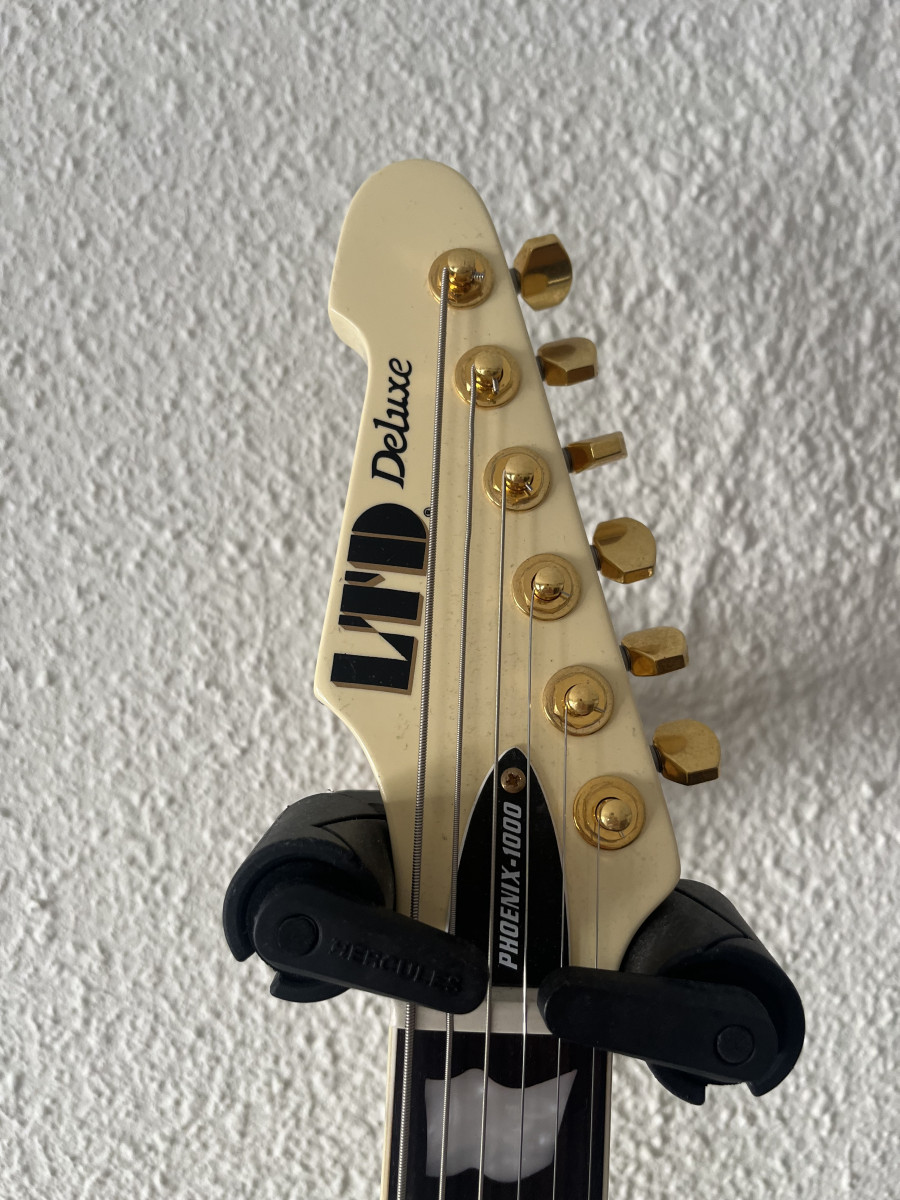 Preciosa guitarra eléctrica ESP LTD Phoenix-1000 Deluxe en acabado vintage white. Pequeña marca en la pintura al lado de una de las pastillas, ver foto. Vino así de fábrica. Por lo demás perfecta. Mástil comodísimo.