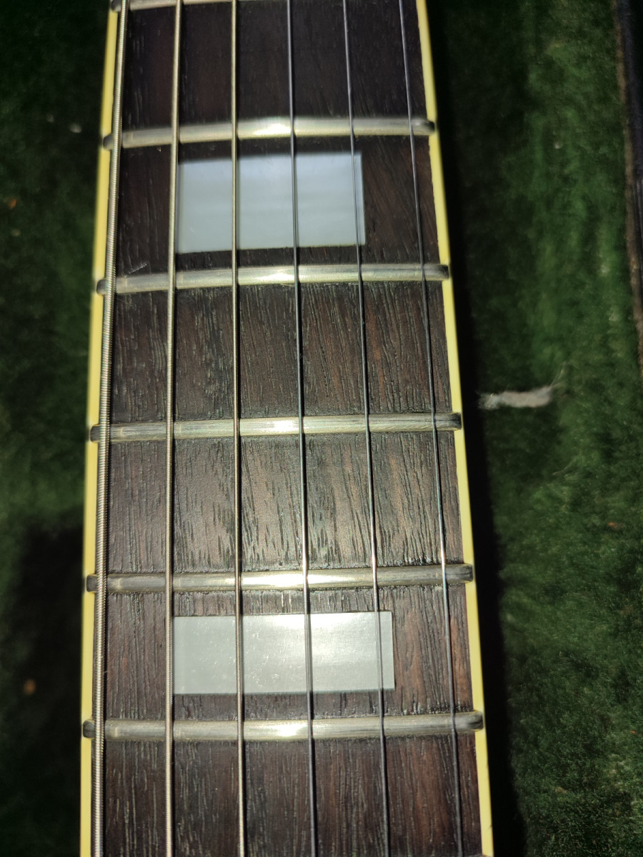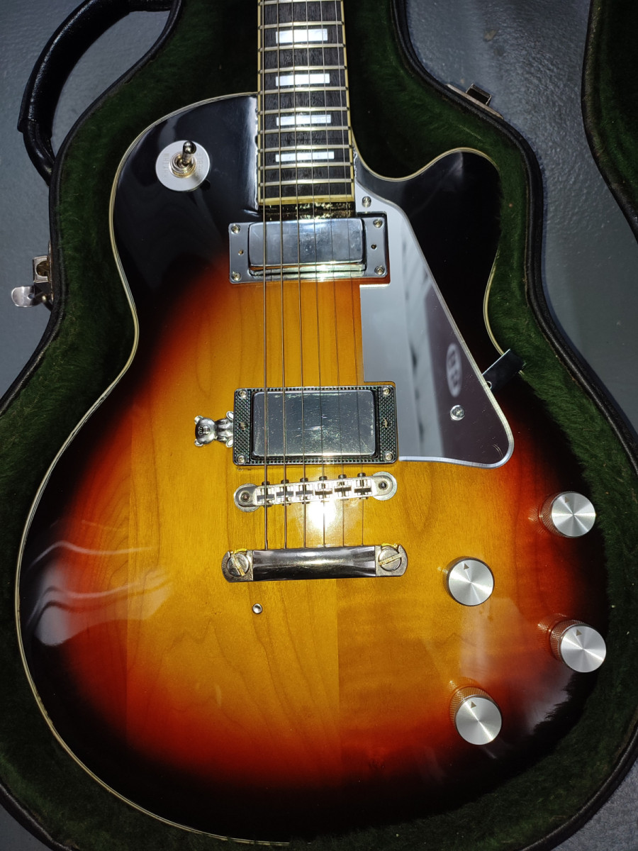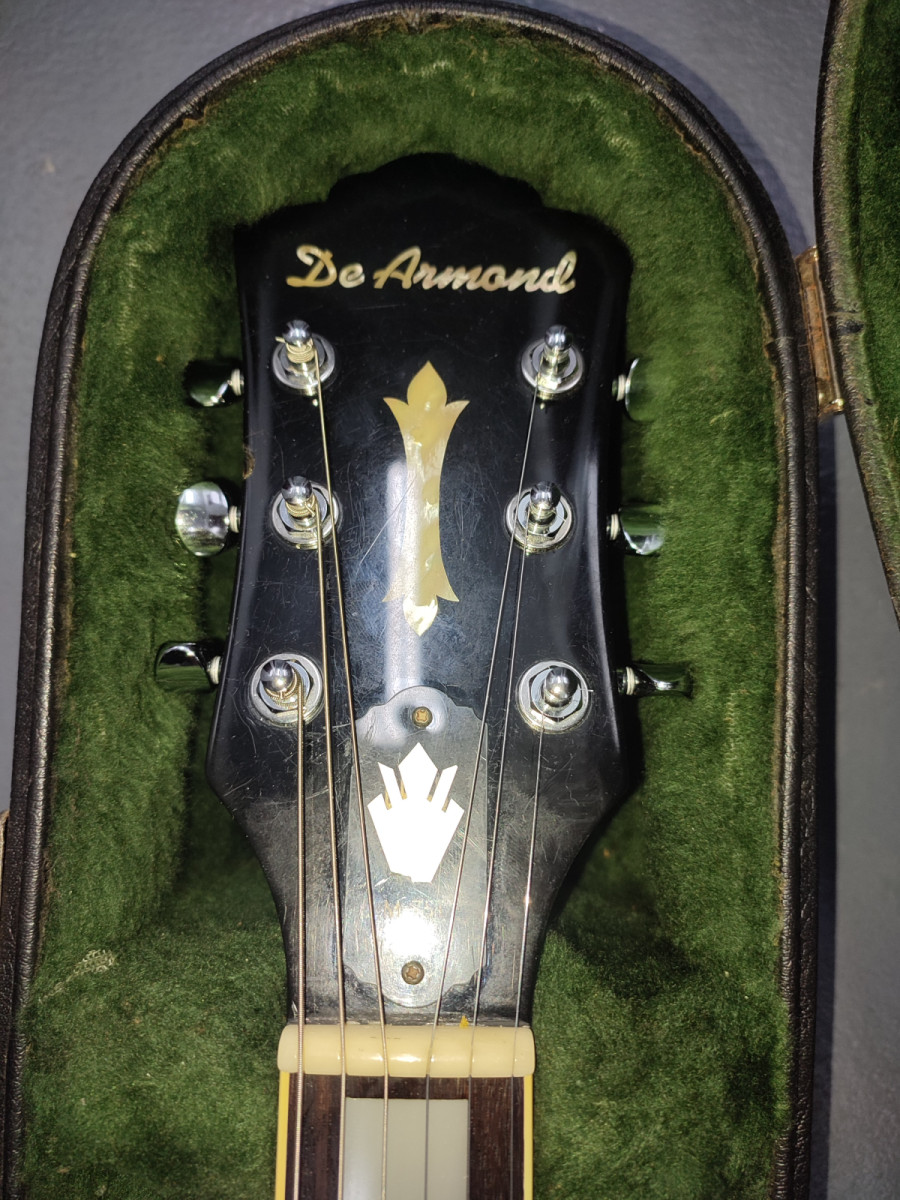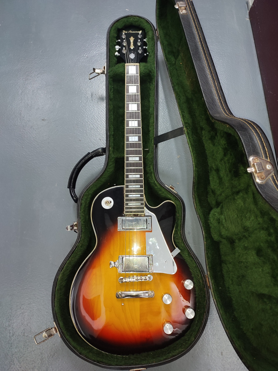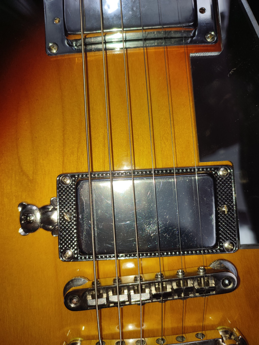 Cambio Guild de armond (años 2000 sparkel color oro y repintada en 2010 en sunburst) recién salida de luthier ajustada, pulido de trastes, cambio de electrónica completa, cambio de potenciómetros, instalada minihumbucker en posición mástil, cubre pastillas.