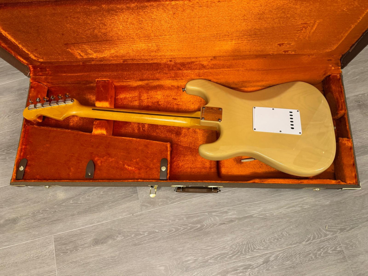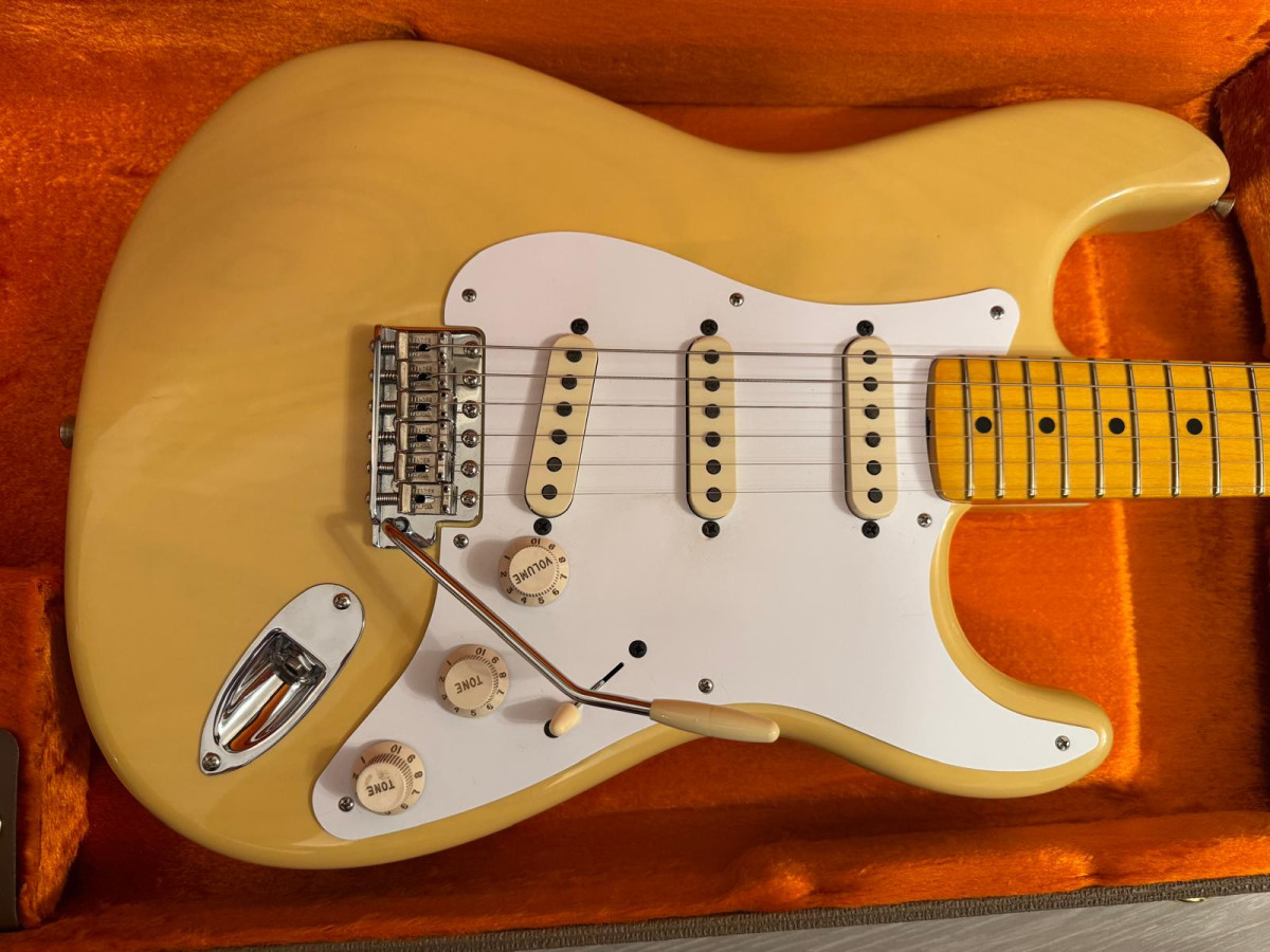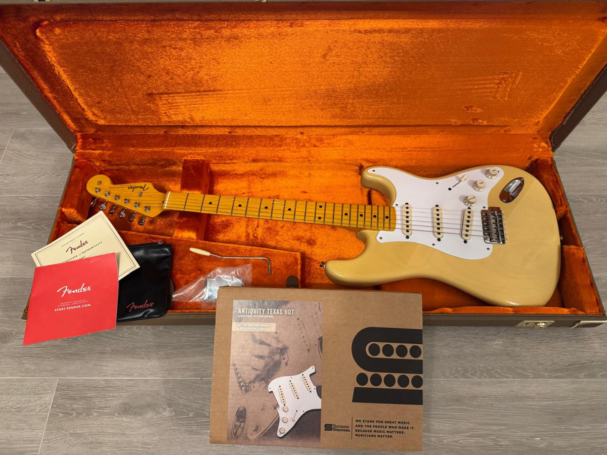 Más allá de las características del modelo publicadas del fabricante – esta fabricada en el 2022, con toda la documentación, certificado fender, estuche fender g&g, palanca tremolo, llaves y accesorios -. Lleva electrónica apantallada y renovada con golpeador seymour duncan antiquity texas hot - que es de lo mejor que existe para stratos vintage y cuesta 750 euros -. Su estado es muy bueno, no tiene golpes, lo único reseñable son dos insignificantes marcas de la nitrocelulosa por la parte posterior del cuerpo por lo que apenas son visibles.