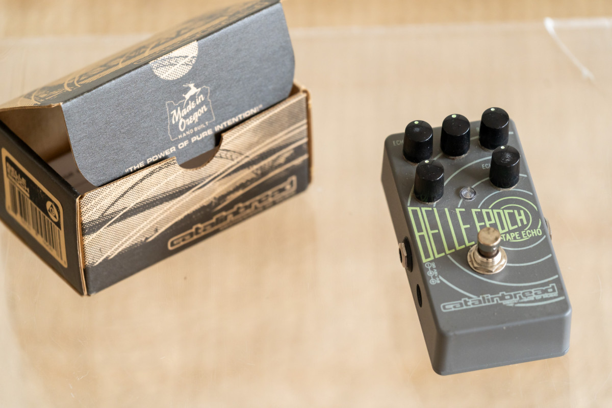 CATALINBREAD BELLE EPOCH Tape Echo voiced delay pedal with discrete touch-sensitive preamp it doesn't convert the direct guitar signal. It replicates EchoPlex EP-3 delay times from 80ms for perfect slapback to 800ms to play like Brian May! The Echo Delay knob replicates the behavior of sliding the tape head across the tape Echo Sustain controls the repeats all the way to self-oscillation Sway adjusts the random tape wow & flutter characteristics Tone controls Record Level to set how hard you are hitting the tape from light and airy all the way to thick and saturated. This knob also controls how loud that initial repeat is. An internal Gain pot sets it to unity or up to a fuzzy boost. An internal switch sets it to true-bypass or trails mode. Runs at 9 volts or 18 volts for more headroom and punch.