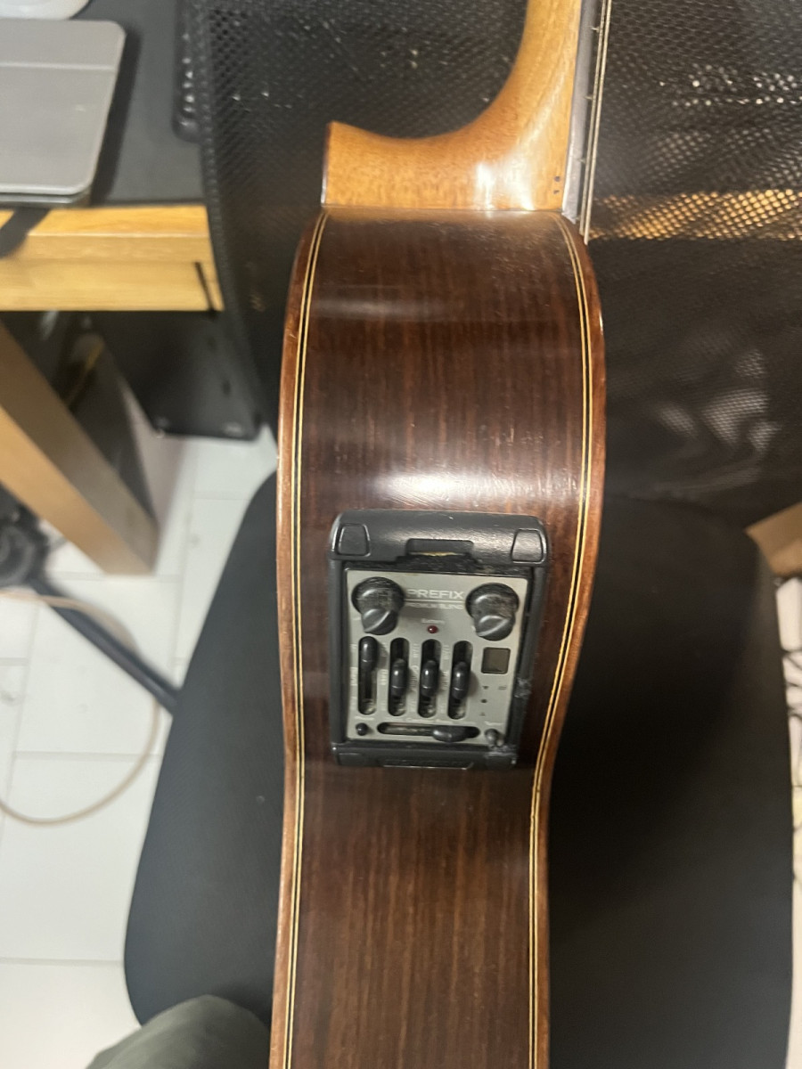 leva instalado un previo el fishman PREFIX premium blend, tiene micro y transductor y como tenia el compartimento de la pila roto, se lo he cambiado poniéndole uno en una cajita interno como los Lr baggs.