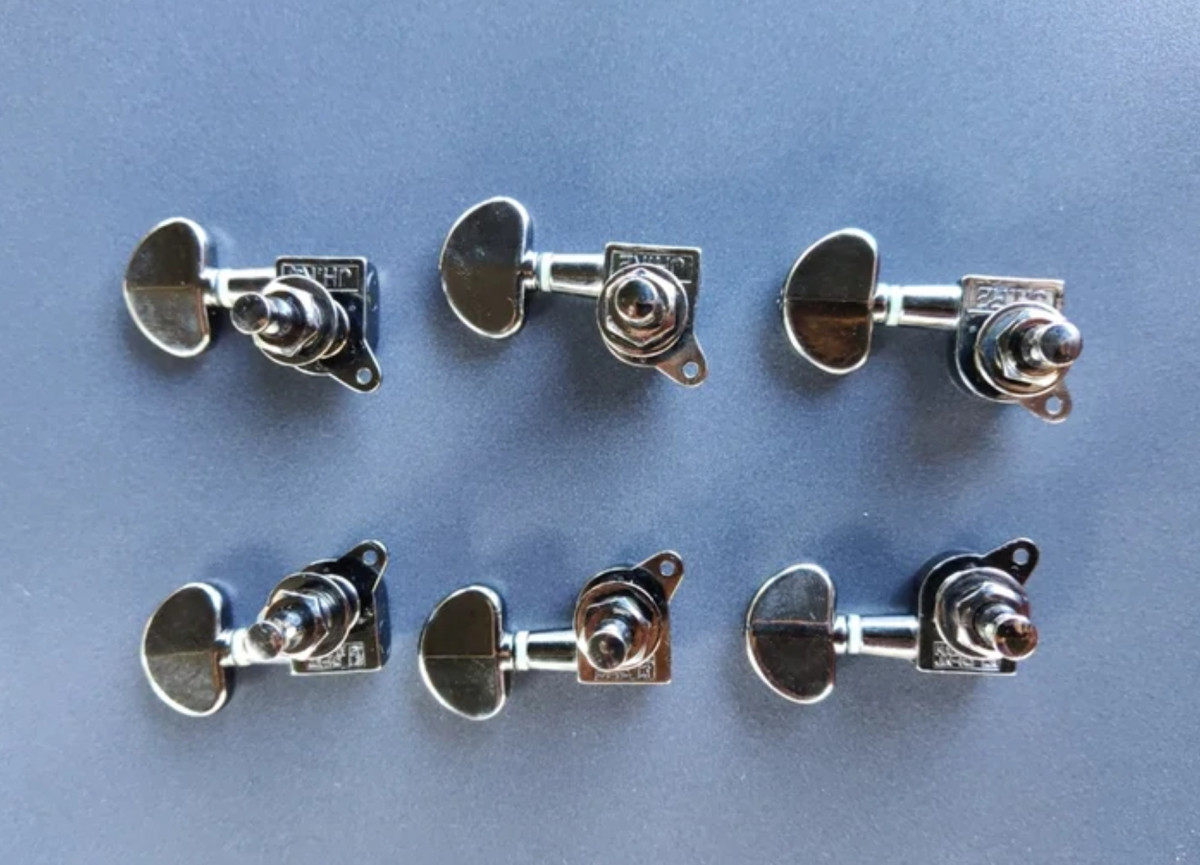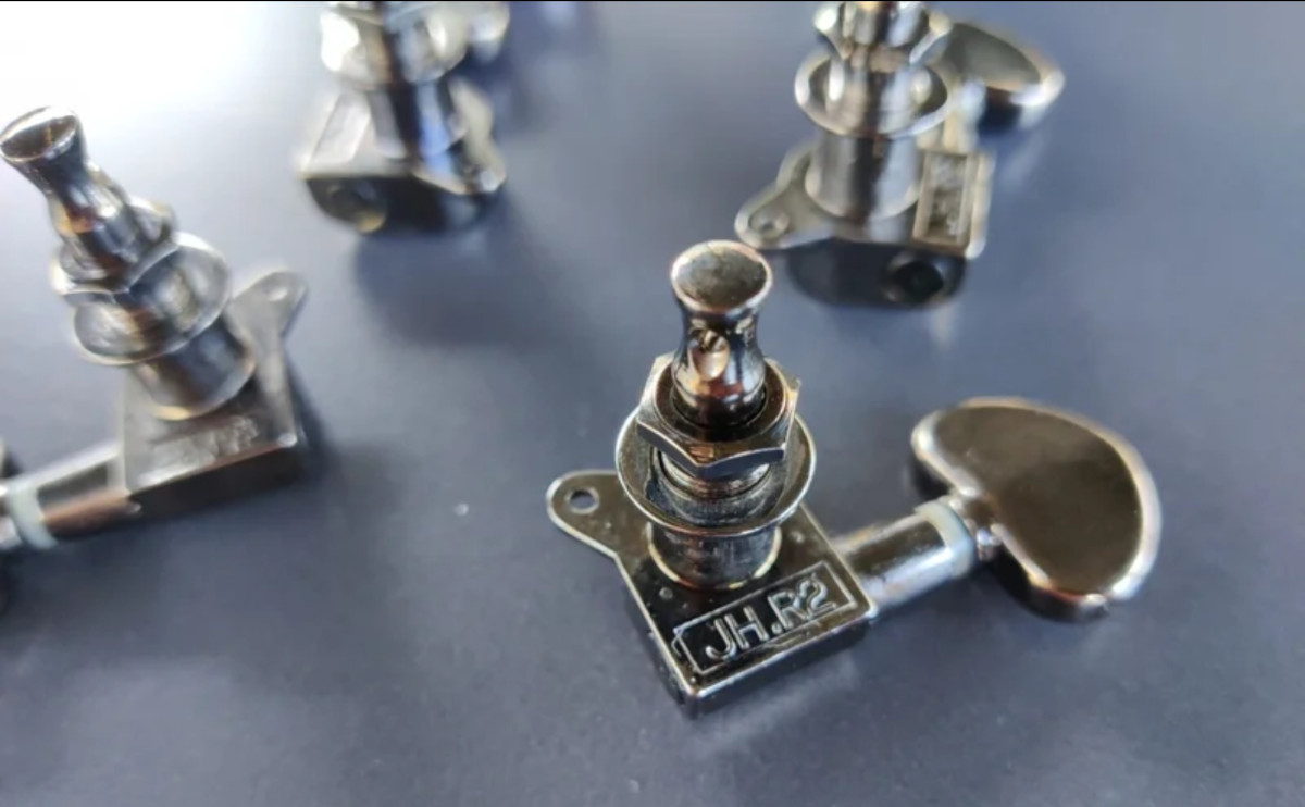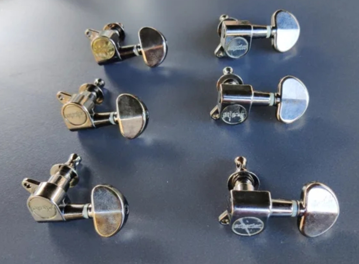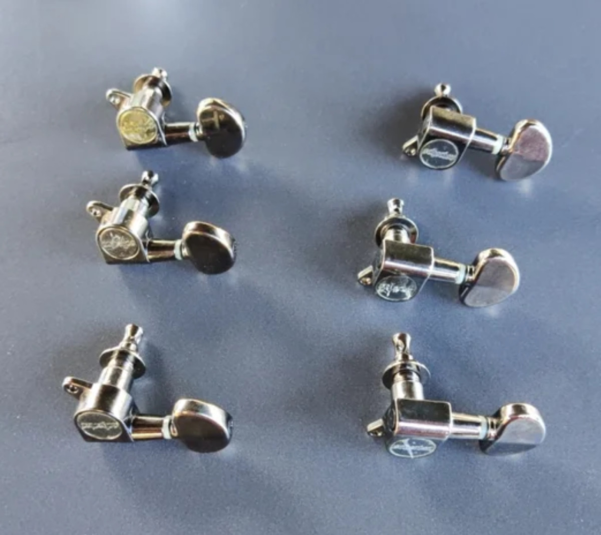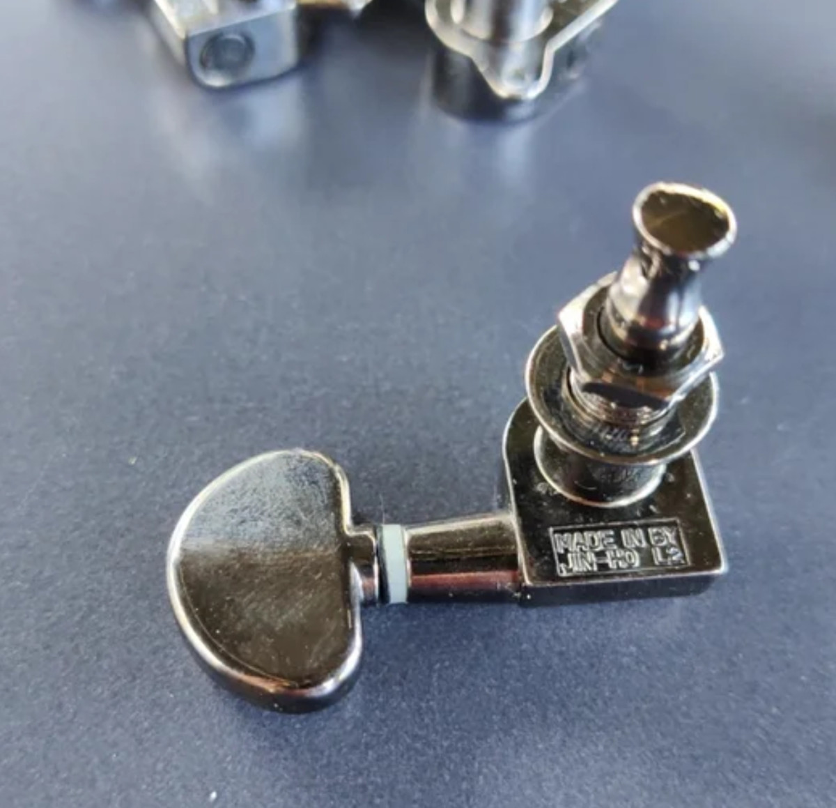 Clavijero 3+3 sacado de una Schecter. Fabricado por Jin Ho. No tengo claro el acabado, ver las fotos, parece como un niquelado tirando a acabado titanio. Diámetro del vástago 9,8mm y distancia de la base del vástago al agujero de insertar la cuerda 23mm