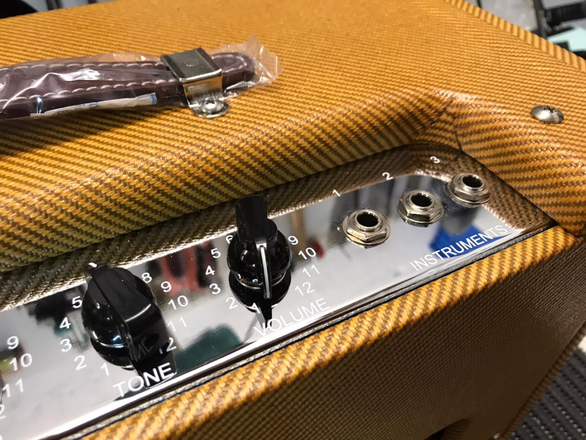 - Mueble de pino macizo de 19mm con uniones "fingerjoined" con cola titebond, recubierto en tweed original Fender y lacado para darle un aspecto "añejo", Frontal de rejilla "Oxblood Gold " el mismo que usa Fender, asa de cuero genuino.