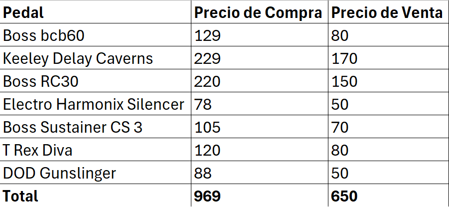 Vendo todo el conjunto de todos los pedales con los cables y el alimentador (no por separado). La tabla de precios puesta es orientativa para daros una idea.