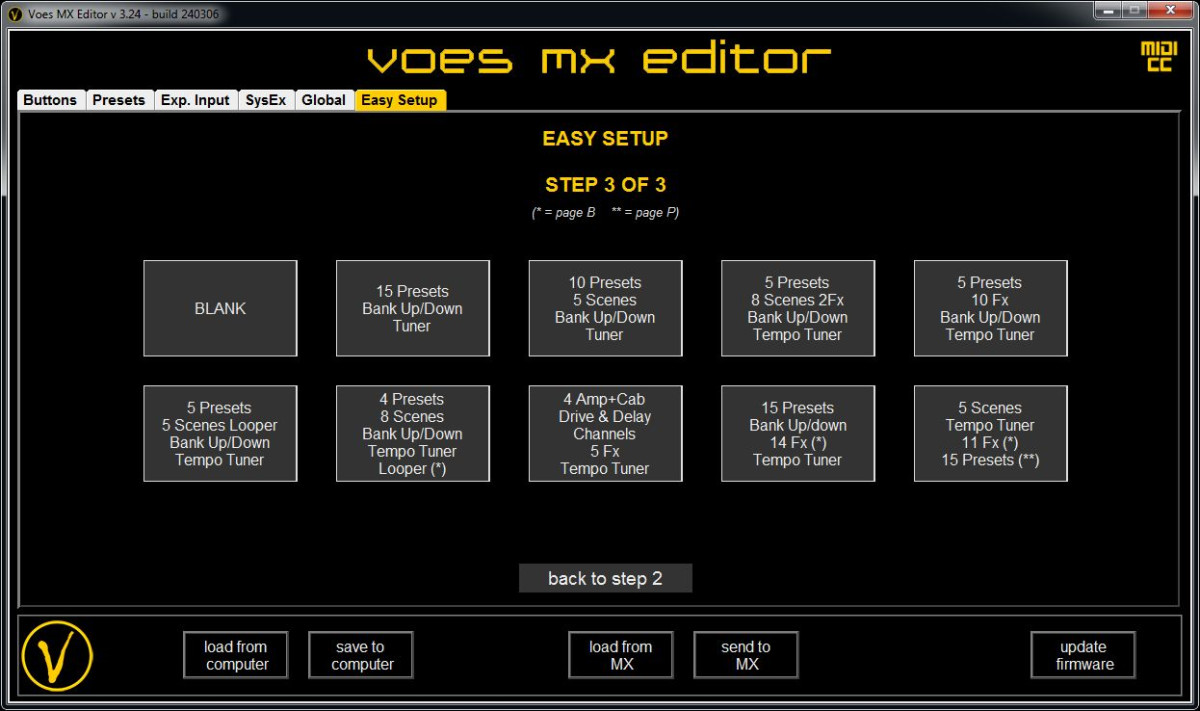 VOES MX-12 se configura mediante software propio (Win o MacOS) para controlar de manera fácil diferentes multiefectos del mercado o cualquier dispositivo vía MIDI, este programable igualmente de manera sencilla a través de software. Con función doble pulsación, dos tipos de pulsación prolongada..., ¿construcción? es un tanque de peso ultra liviano. Posibilidad de conectar diferentes pedales de expresión incluida el bypass de uno de ellos. Posee pantalla, podrás ver nombre del preset, afinación...