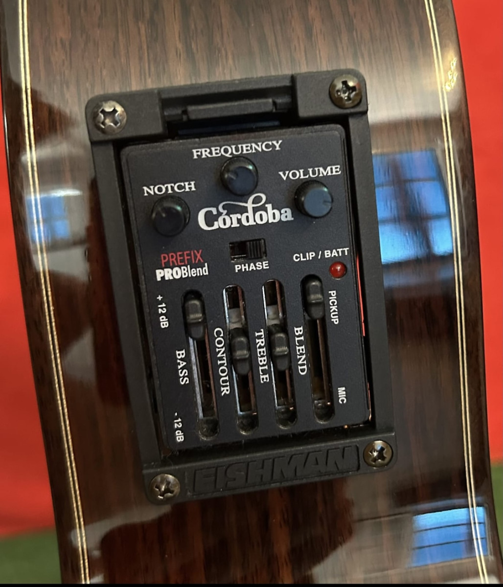 Clavijas de afinación doradas Cordoba Premium.Sistema de pastilla Fishman Prefix ProBlend con ecualizador de 3 bandas